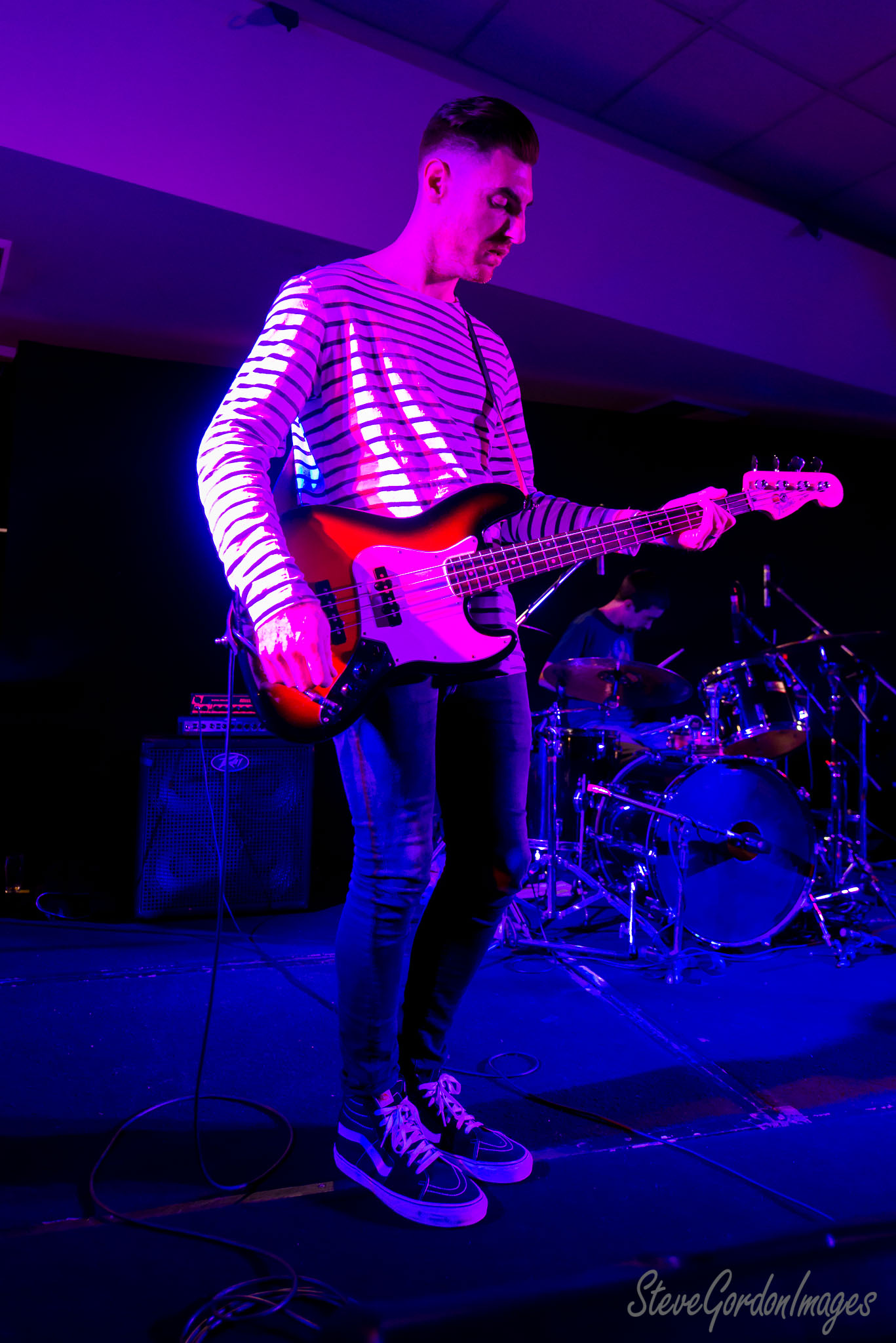 Purple Stage Bassist Striped Shirt Performance.