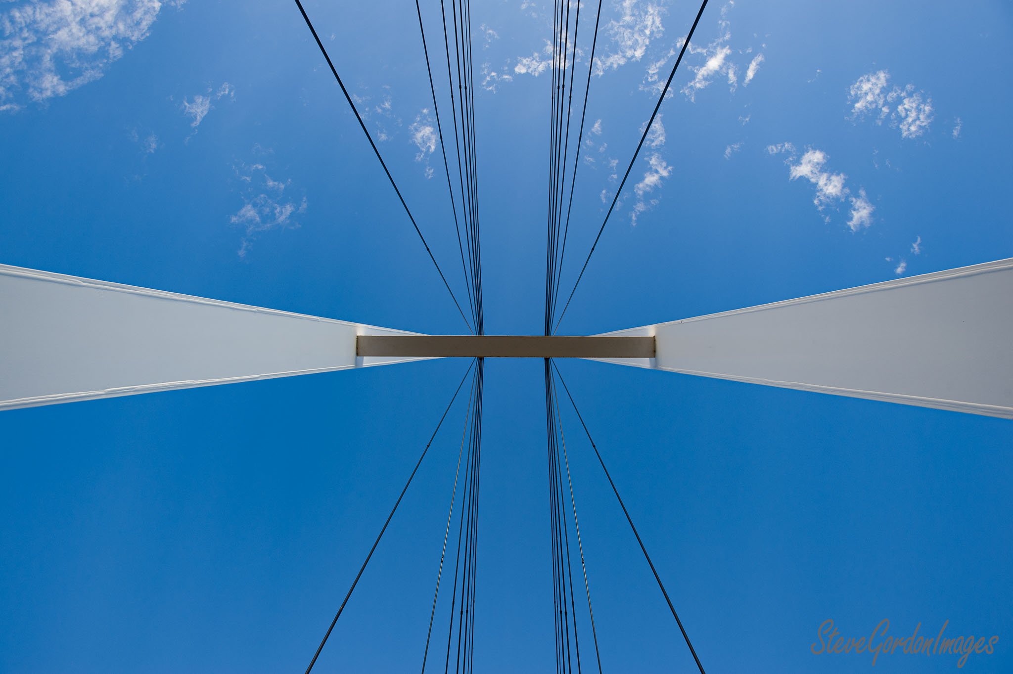 GalleriesArtsStyleColourBlueSky Bridge Cables White Blue Sky Bridge Cables White Blue A bridge's cables and support structure are seen against a blue sky, providing structural support for crossing. Sky Bridge Cables White Blue