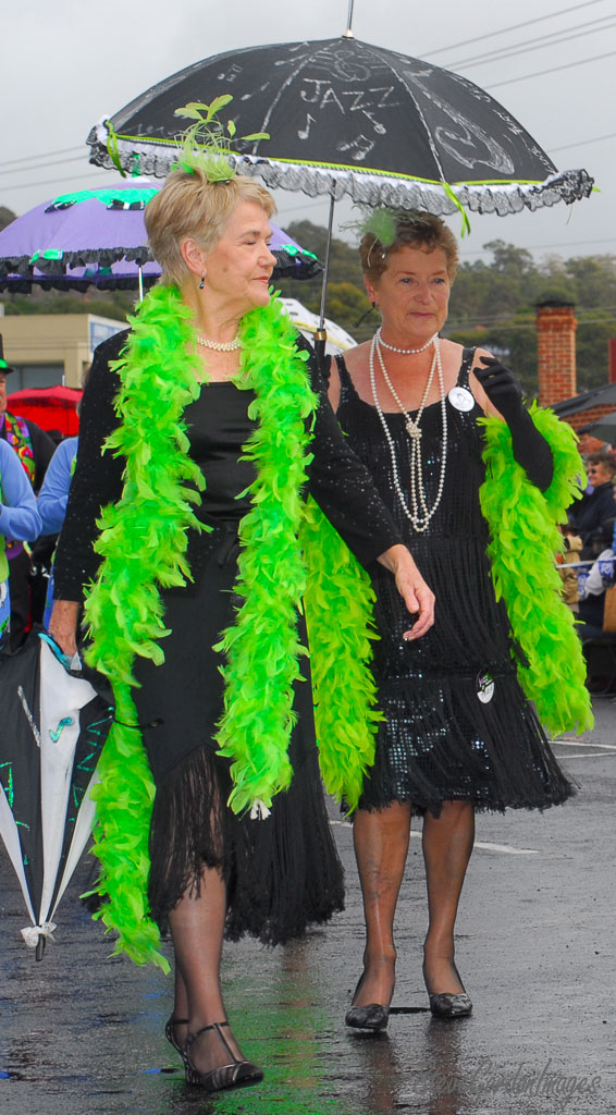 GalleriesArtsStyleColourGreenJazz Parade Ladies Green Feathers Jazz Parade Ladies Green Feathers Two women in flapper attire walk in the rain, protected by jazz-themed umbrellas, likely at a parade or festival. Jazz Parade Ladies Green Feathers