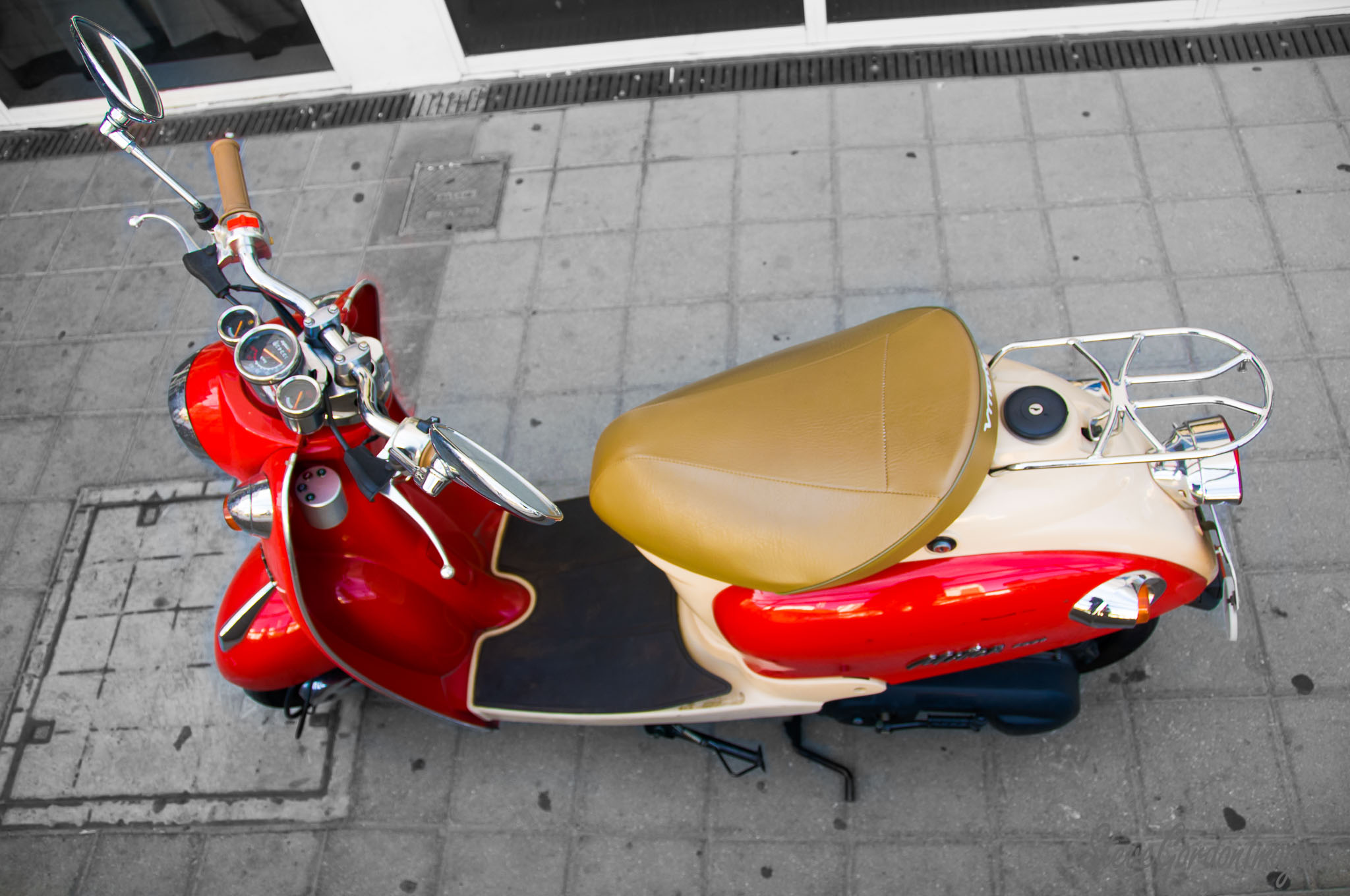 GalleriesArtsStyleColourRedRed Scooter On Gray Pavement Red Scooter On Gray Pavement A vintage scooter sits parked on the sidewalk, ready for a leisurely ride. The red and cream colors pop against the gray pavement. Red Scooter On Gray Pavement
