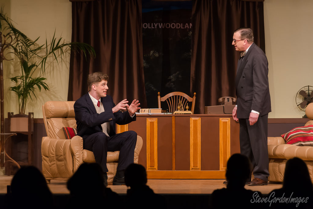 GalleriesArtsTheatre10 Moonlight and MagnoliasPerformancesStage Play, Two Actors, Drama. Stage Play, Two Actors, Drama. Two men act on stage, one seated, gesturing. The backdrop reads "HOLLYWOODLAND". A play is in progress. Stage Play, Two Actors, Drama.