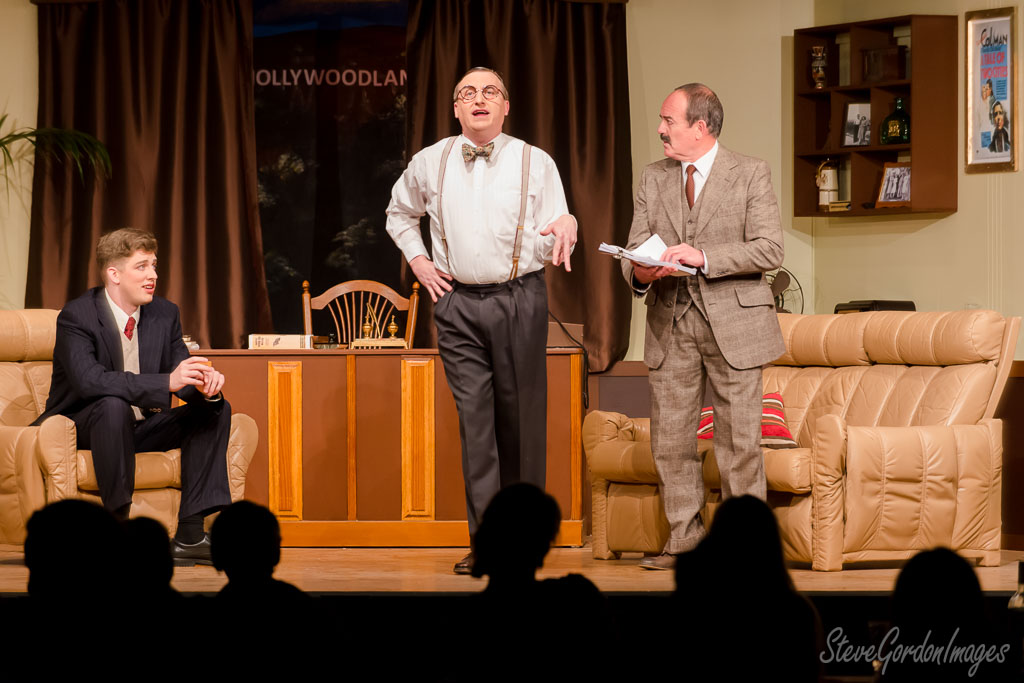 GalleriesArtsTheatre10 Moonlight and MagnoliasPerformancesStage Play, Actors, Audience, Drama. Stage Play, Actors, Audience, Drama. Actors perform on stage, "HOLLYWOODLAND" backdrop. One man gestures, another holds papers, a third sits. Stage Play, Actors, Audience, Drama.