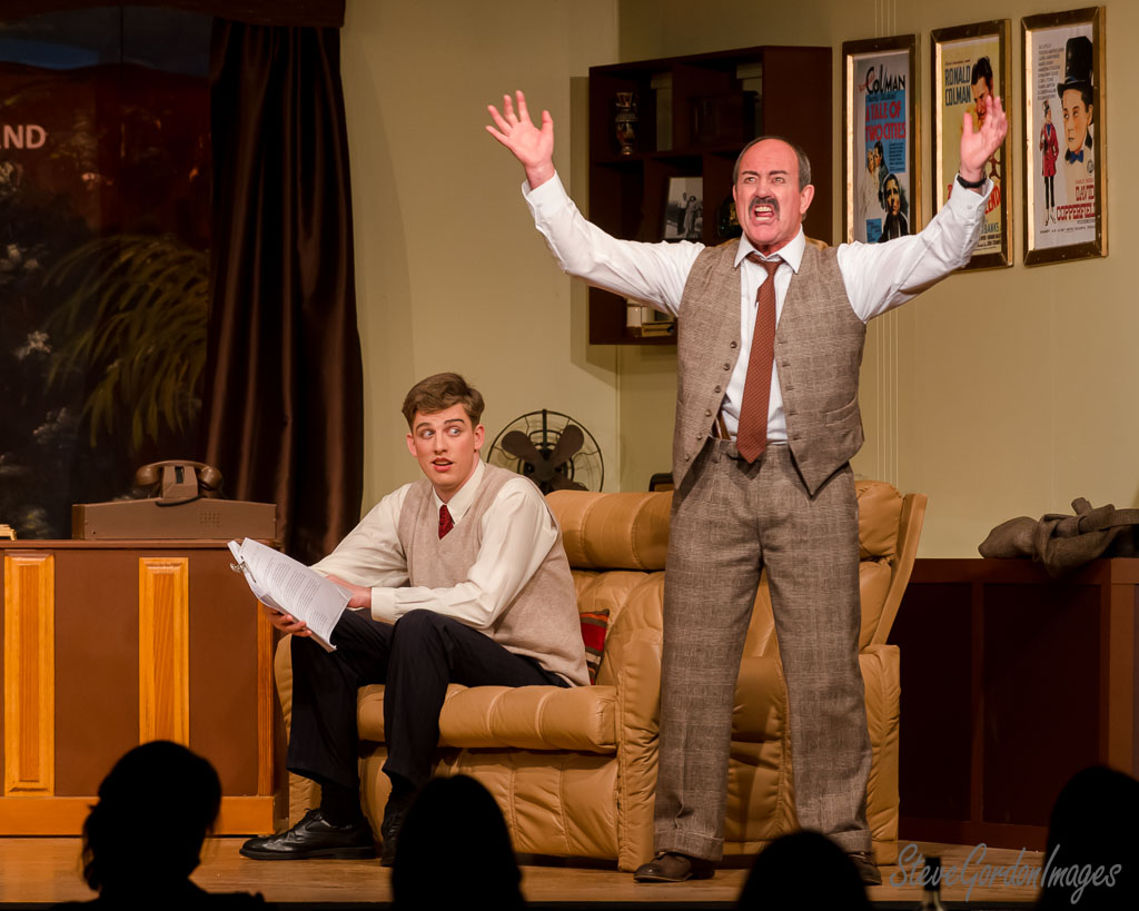 GalleriesArtsTheatre10 Moonlight and MagnoliasPerformancesActors On Stage, Vintage Drama. Actors On Stage, Vintage Drama. Two actors perform on stage. One gestures dramatically, the other reacts while reading a script. Posters of "Ronald Colman" are visible. Actors On Stage, Vintage Drama.