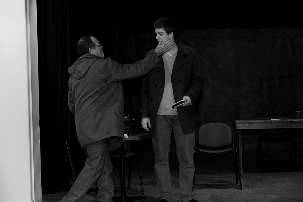 GalleriesArtsTheatre10 Moonlight and MagnoliasRehearsalsStage Drama: A Touching Moment. Stage Drama: A Touching Moment. Two men on stage, one touches the other's face. A typewriter sits on a table. They are acting. Stage Drama: A Touching Moment.