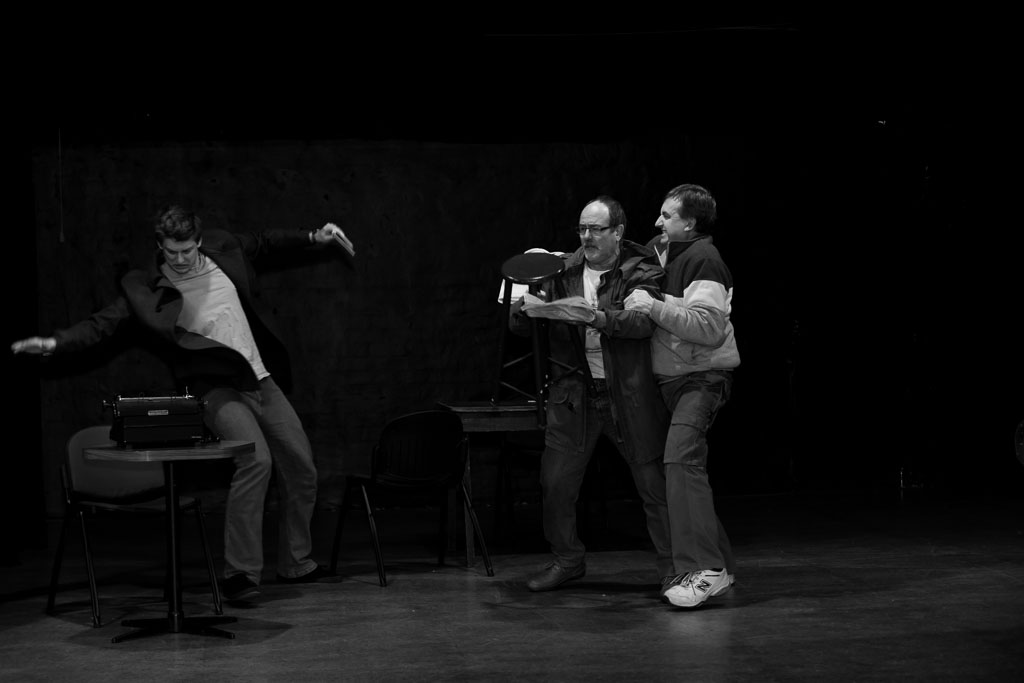 GalleriesArtsTheatre10 Moonlight and MagnoliasRehearsalsDramatic Scene, Black And White. Dramatic Scene, Black And White. A man, with a typewriter, is pushed away as two men struggle over a chair and papers. Dramatic Scene, Black And White.