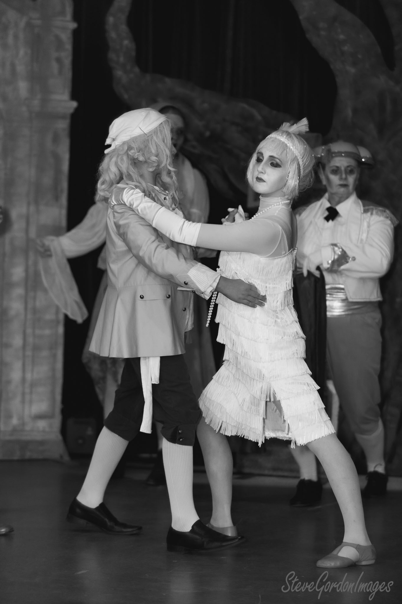 GalleriesArtsTheatre11 Addams FamilyCostumed Dancers Embrace, Stage Performance. Two dancers in costume perform, a man in a jacket and a woman in a flapper dress, on stage. Other actors watch. Costumed Dancers Embrace, Stage Performance.