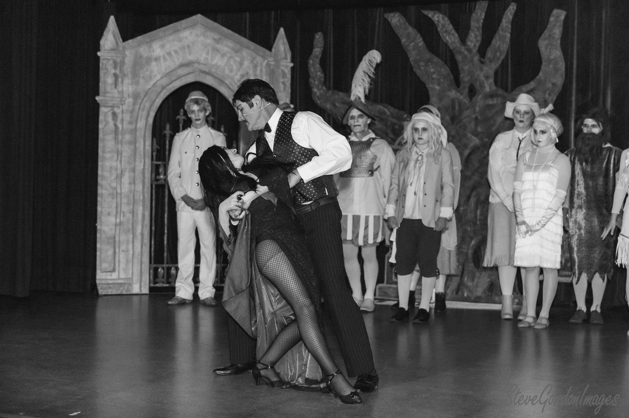 GalleriesArtsTheatre11 Addams FamilyStage Drama, Black And White. On stage, a man and woman dance. Other actors watch. The backdrop reads "ADDAMS". Stage Drama, Black And White.