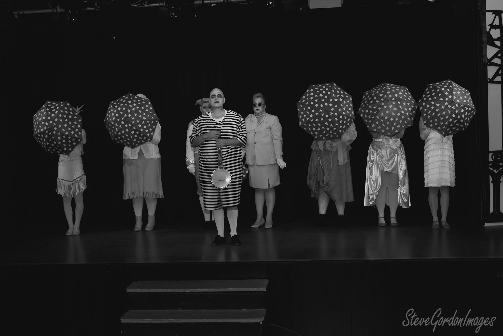 GalleriesArtsTheatre11 Addams FamilyStage Performers With Starry Umbrellas. A costumed group, including a striped-suit man with a banjo, stand on stage with star-covered umbrellas. Stage Performers With Starry Umbrellas.