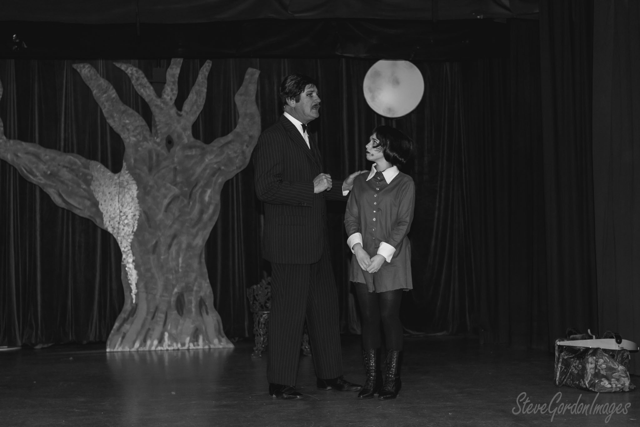 GalleriesArtsTheatre11 Addams FamilyAddams Family Stage Play Scene. A man in a pinstripe suit and Wednesday Addams on stage, under a moon prop. They are acting. Addams Family Stage Play Scene.