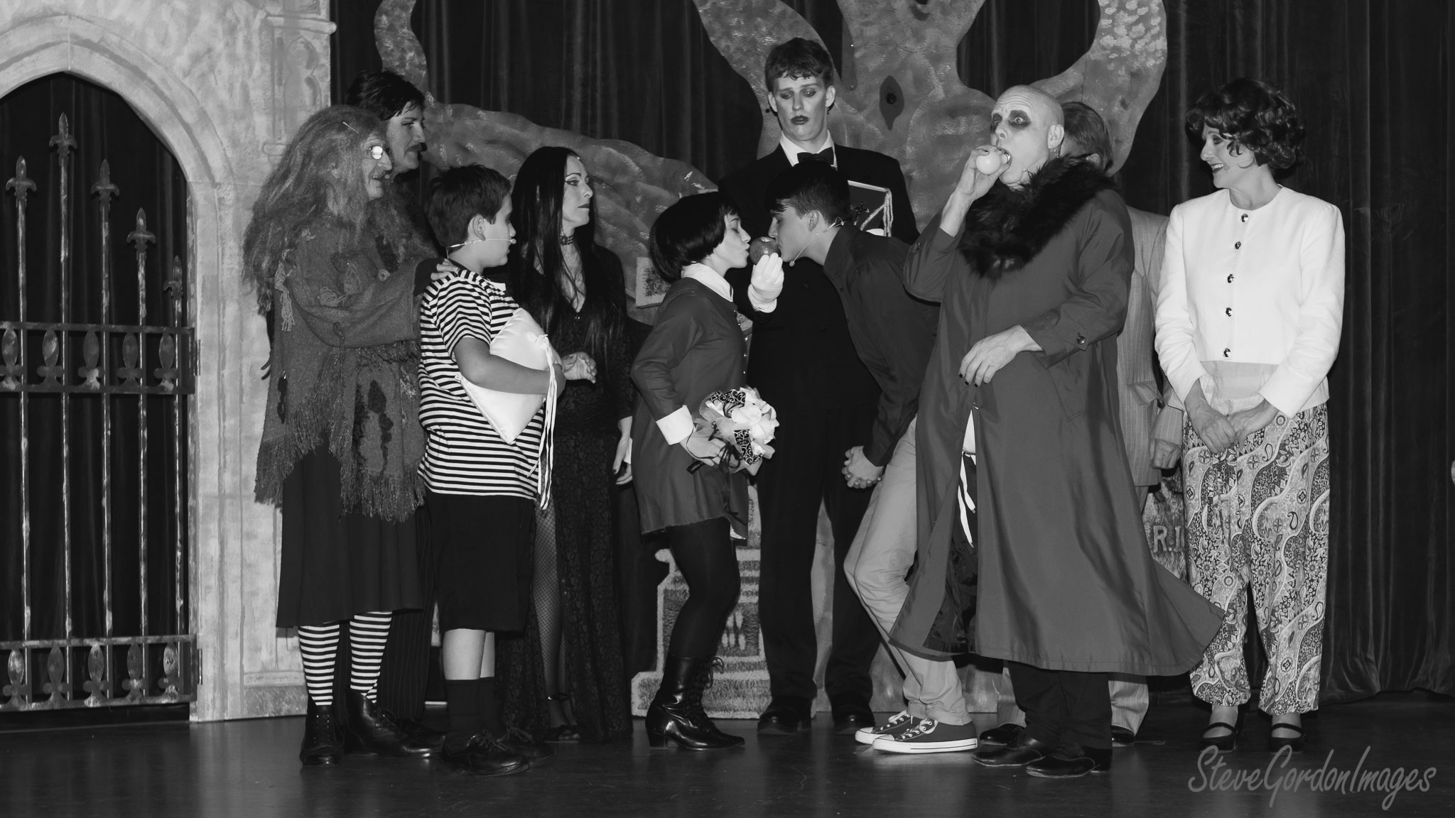GalleriesArtsTheatre11 Addams FamilyTheatrical Cast, Black And White. The Addams Family cast, in costume, on stage. Gomez eats an apple as Wednesday and Pugsley look on. Theatrical Cast, Black And White.