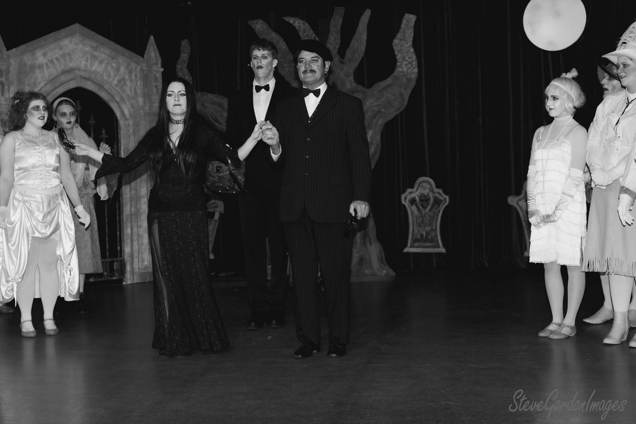 GalleriesArtsTheatre11 Addams FamilyAddams Family Stage Play Scene. The Addams Family cast, including Morticia and Gomez, perform on stage, with a RIP tombstone prop. Addams Family Stage Play Scene.