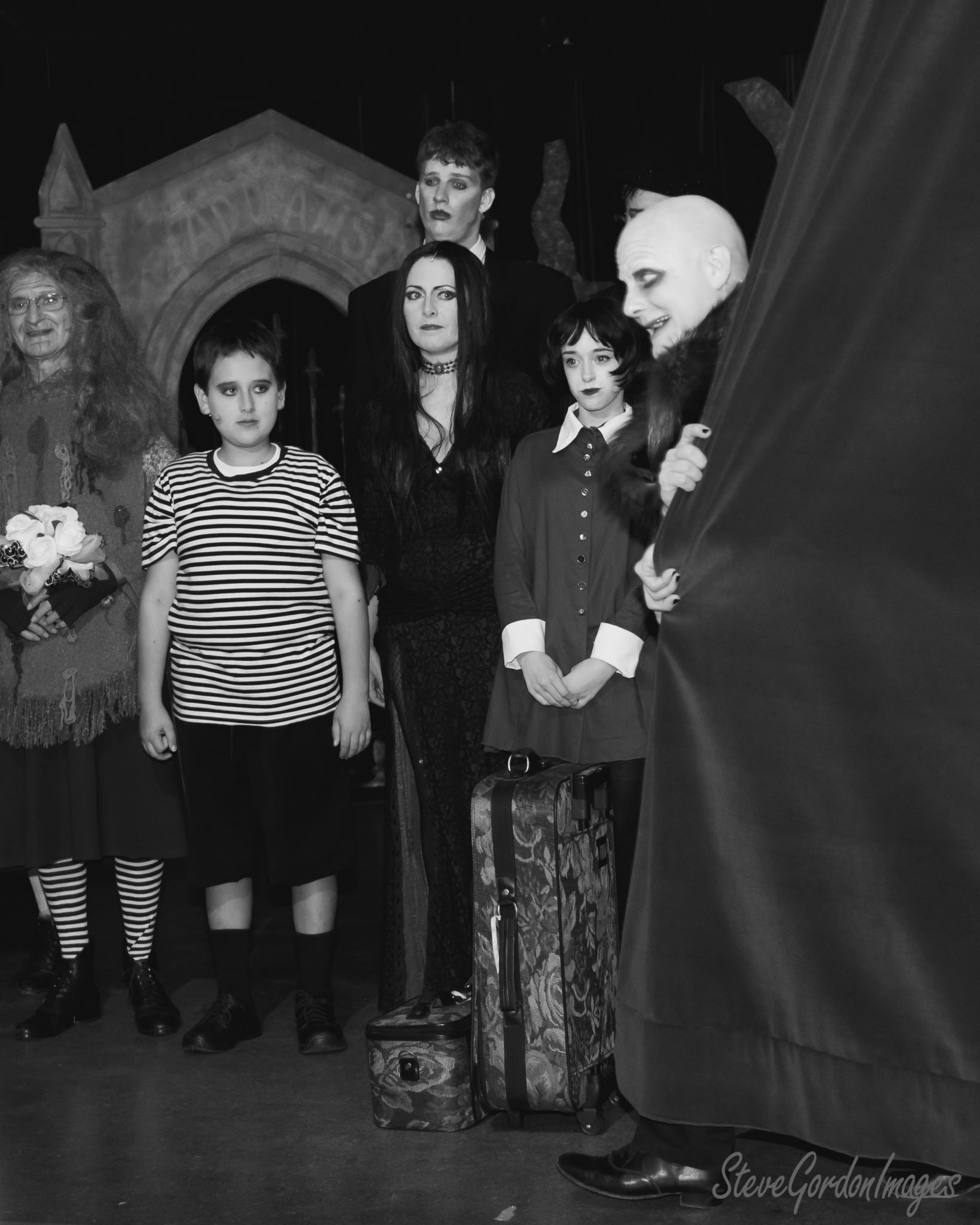 GalleriesArtsTheatre11 Addams FamilyThe Addams Family Stage Production. The Addams Family cast, including Morticia, Gomez, and Wednesday, stand before a "ADDAMS" arch. The Addams Family Stage Production.