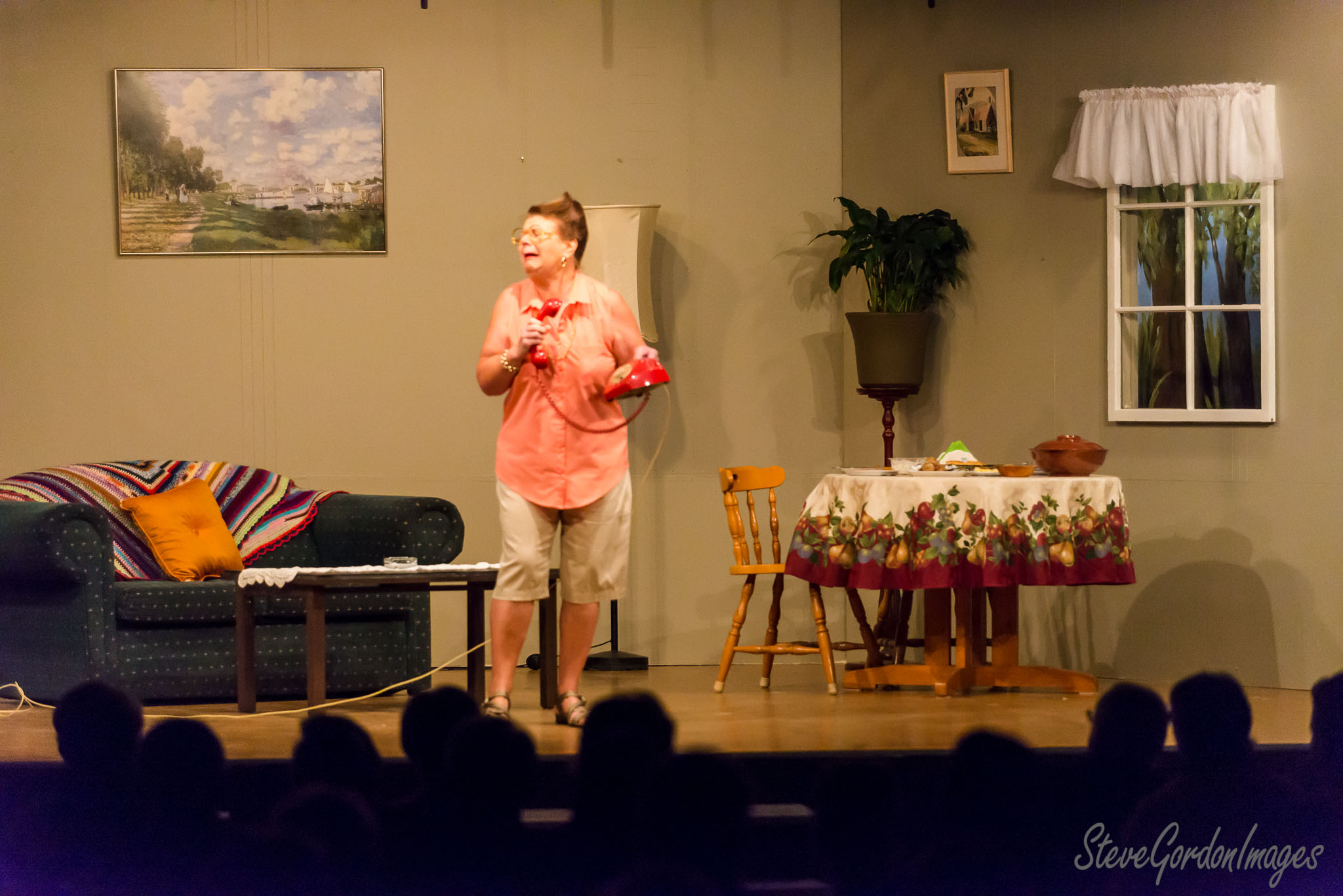 GalleriesArtsTheatre12 Sordid LivesPerformancesStage Play, Woman, Red Telephone. A woman, holding a red phone, performs on stage in a play, in front of an audience. Stage Play, Woman, Red Telephone.