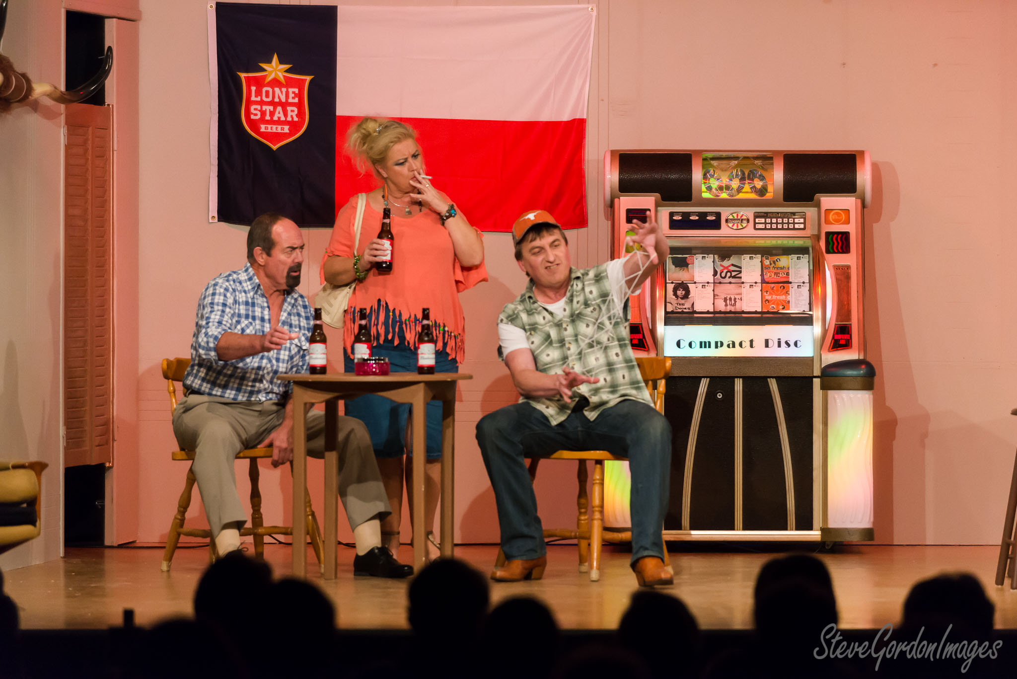 GalleriesArtsTheatre12 Sordid LivesPerformancesTexas Bar Scene, Stage Play. Three actors perform a scene, with beer and a jukebox, under a Lone Star flag. Texas Bar Scene, Stage Play.