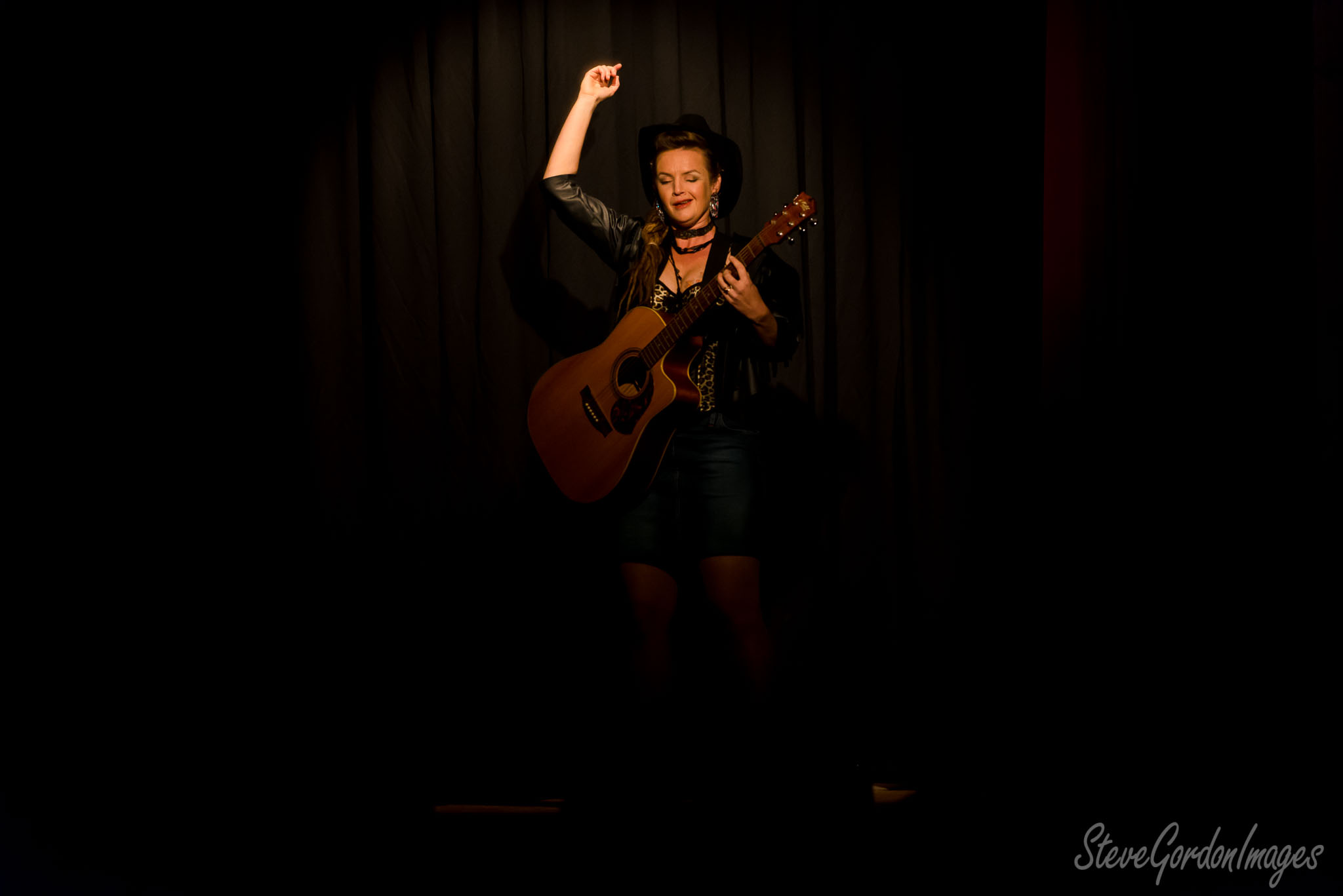 GalleriesArtsTheatre12 Sordid LivesPerformancesCowgirl With Guitar, Stage Lit. A woman with a guitar performs on stage, wearing a hat and leather jacket, enjoying the moment. Cowgirl With Guitar, Stage Lit.