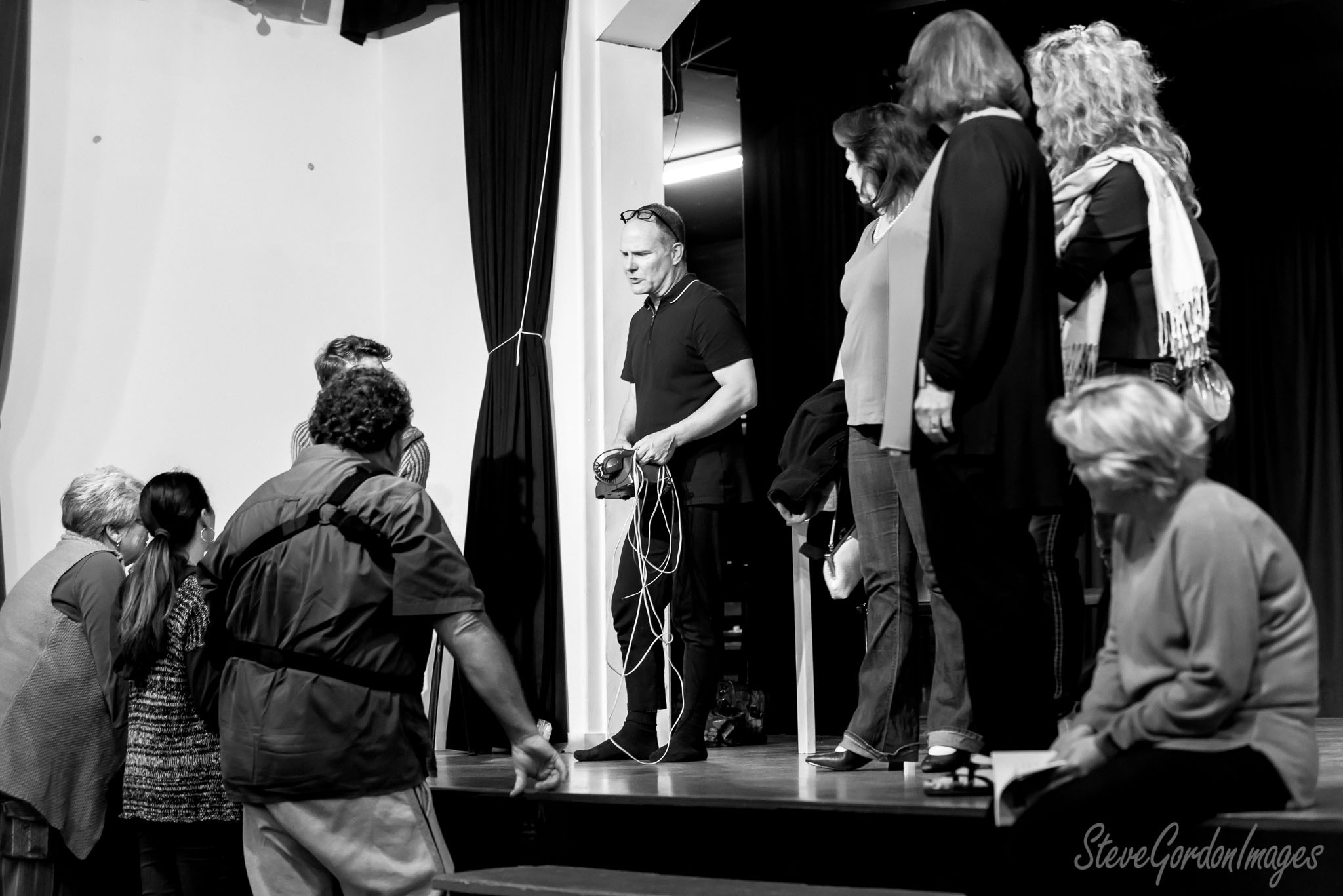 GalleriesArtsTheatre12 Sordid LivesRehearsalsStage Crew, Rehearsal, Black And White. A man holds a headset with wires, a group of people stand on stage, a rehearsal. Stage Crew, Rehearsal, Black And White.