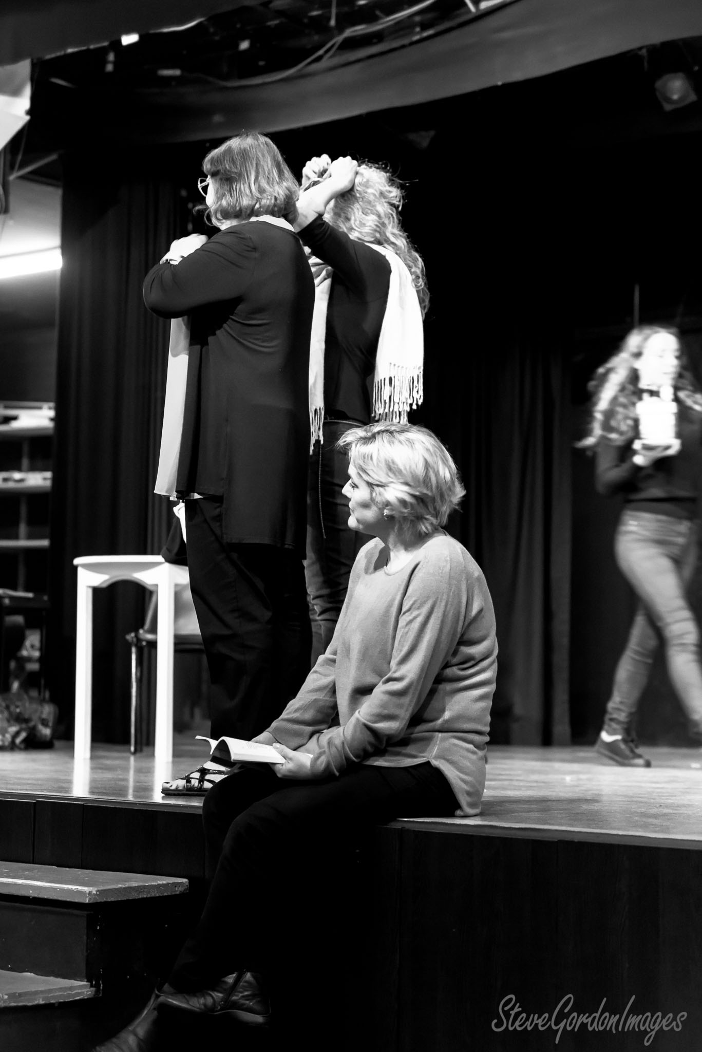 GalleriesArtsTheatre12 Sordid LivesRehearsalsStage Rehearsal, Black And White. On stage, a woman reads a book while two others prepare, a fourth walks by. Stage Rehearsal, Black And White.
