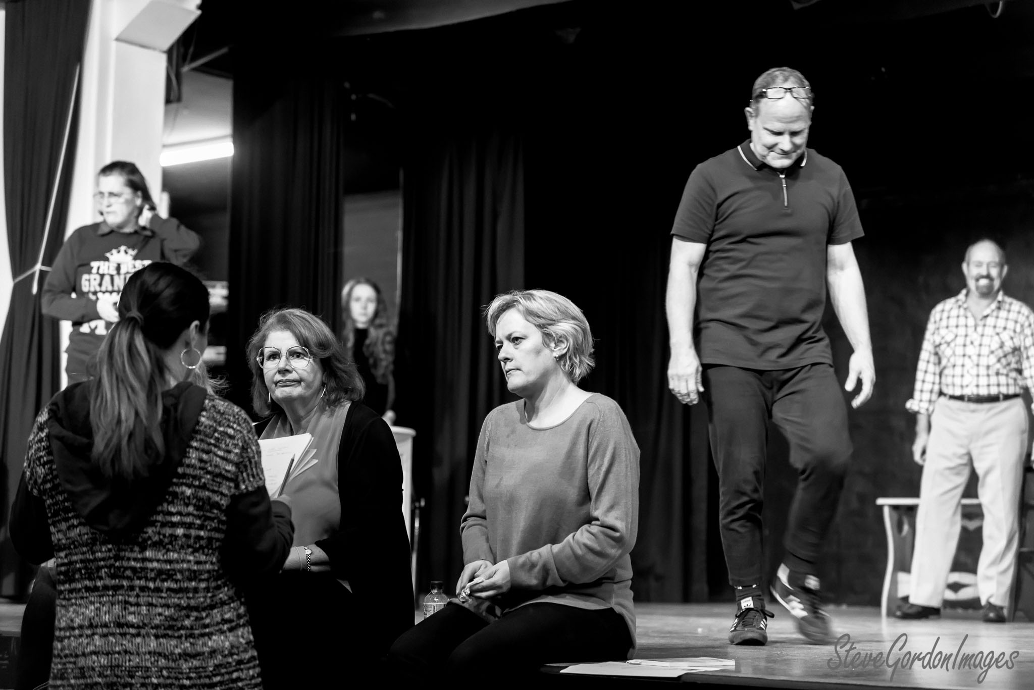 GalleriesArtsTheatre12 Sordid LivesRehearsalsRehearsal Scene, Black And White. A rehearsal: Actors and director on stage. "The Best Gran" shirt is visible. Man walks forward. Rehearsal Scene, Black And White.