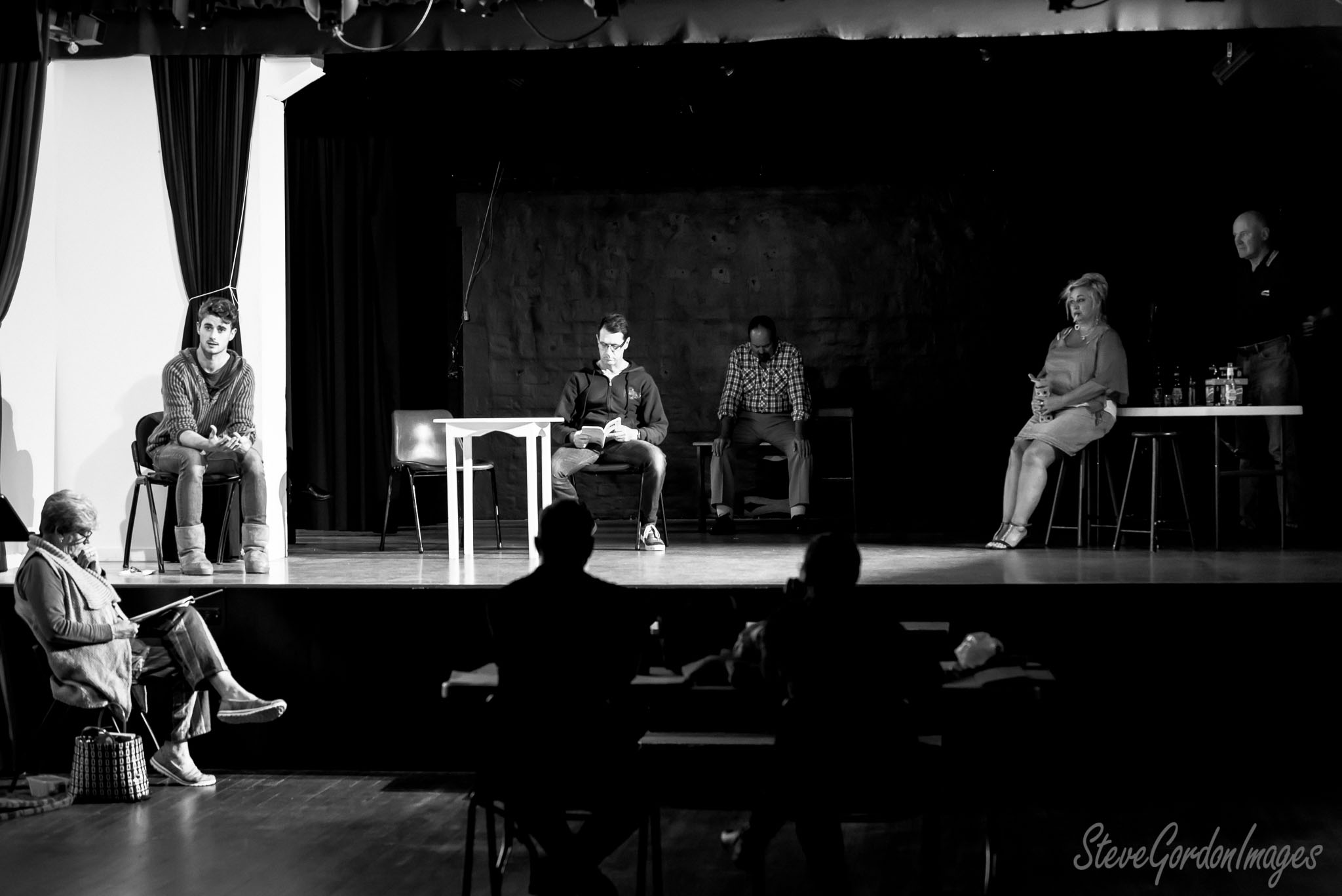 GalleriesArtsTheatre12 Sordid LivesRehearsalsStage Rehearsal, Black And White. Actors rehearse a play on stage. One reads, others sit, and a man stands by a table with bottles. Stage Rehearsal, Black And White.
