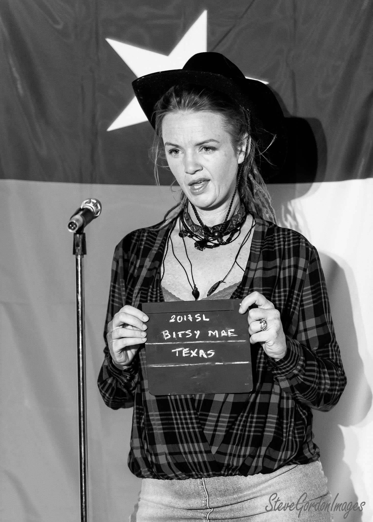 GalleriesArtsTheatre12 Sordid LivesRehearsalsTexas Woman, Black And White. A woman, "Bitsy Mae" from "Texas", holds a slate with "2017 SL" in front of a microphone. Texas Woman, Black And White.