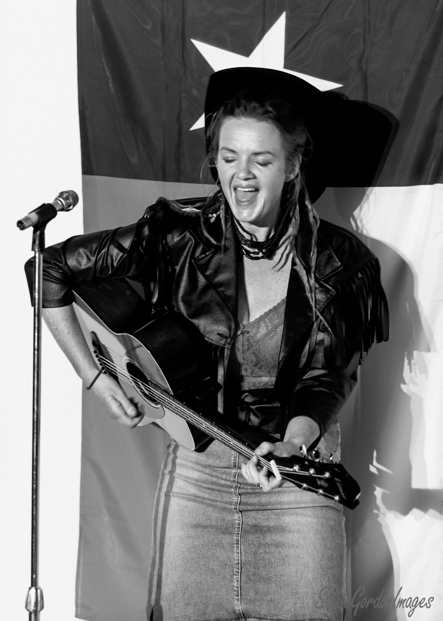GalleriesArtsTheatre12 Sordid LivesRehearsalsSinger, Guitar, Black And White. A woman plays guitar, sings into a microphone, and performs on stage in front of a flag. Singer, Guitar, Black And White.