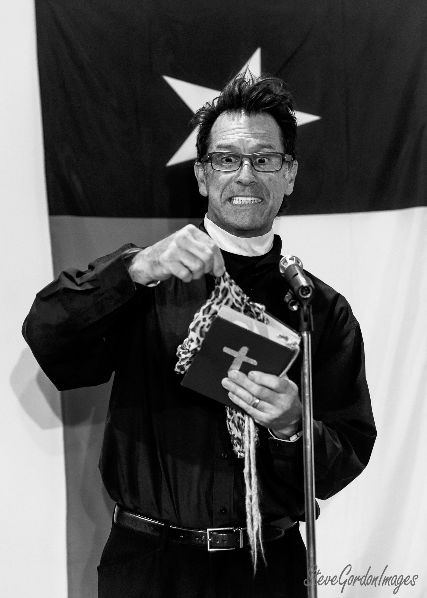 GalleriesArtsTheatre12 Sordid LivesRehearsalsPreacher's Fury, Bible, Leopard Scarf. A preacher, holding a Bible with a cross, gestures with a scarf at a microphone. The flag has a star. Preacher's Fury, Bible, Leopard Scarf.