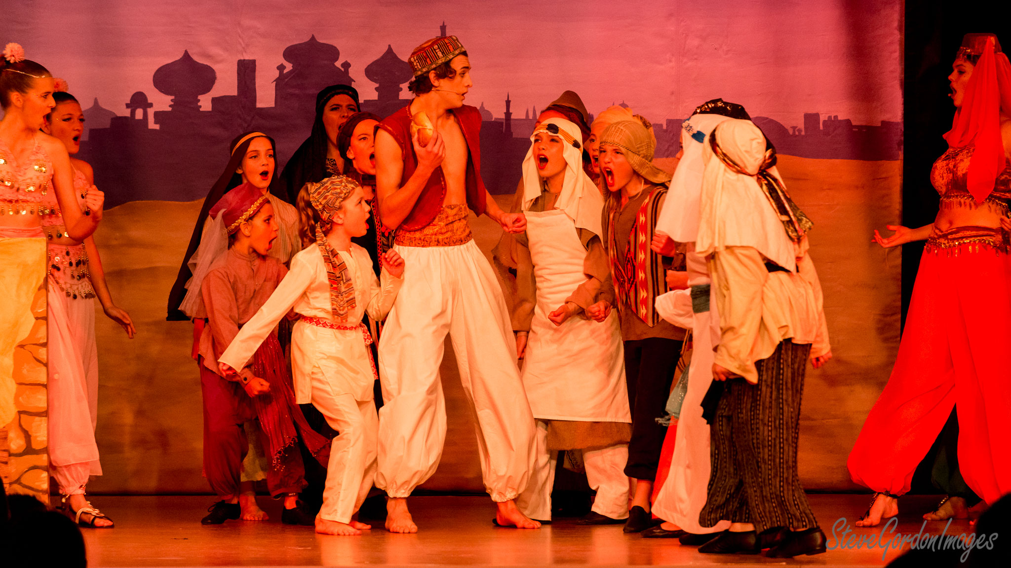 GalleriesArtsTheatre13 AladinPerformancesArabian Nights Stage Play Scene. A stage production of Aladdin. The main character, holding an apple, is surrounded by a crowd of actors. Arabian Nights Stage Play Scene.