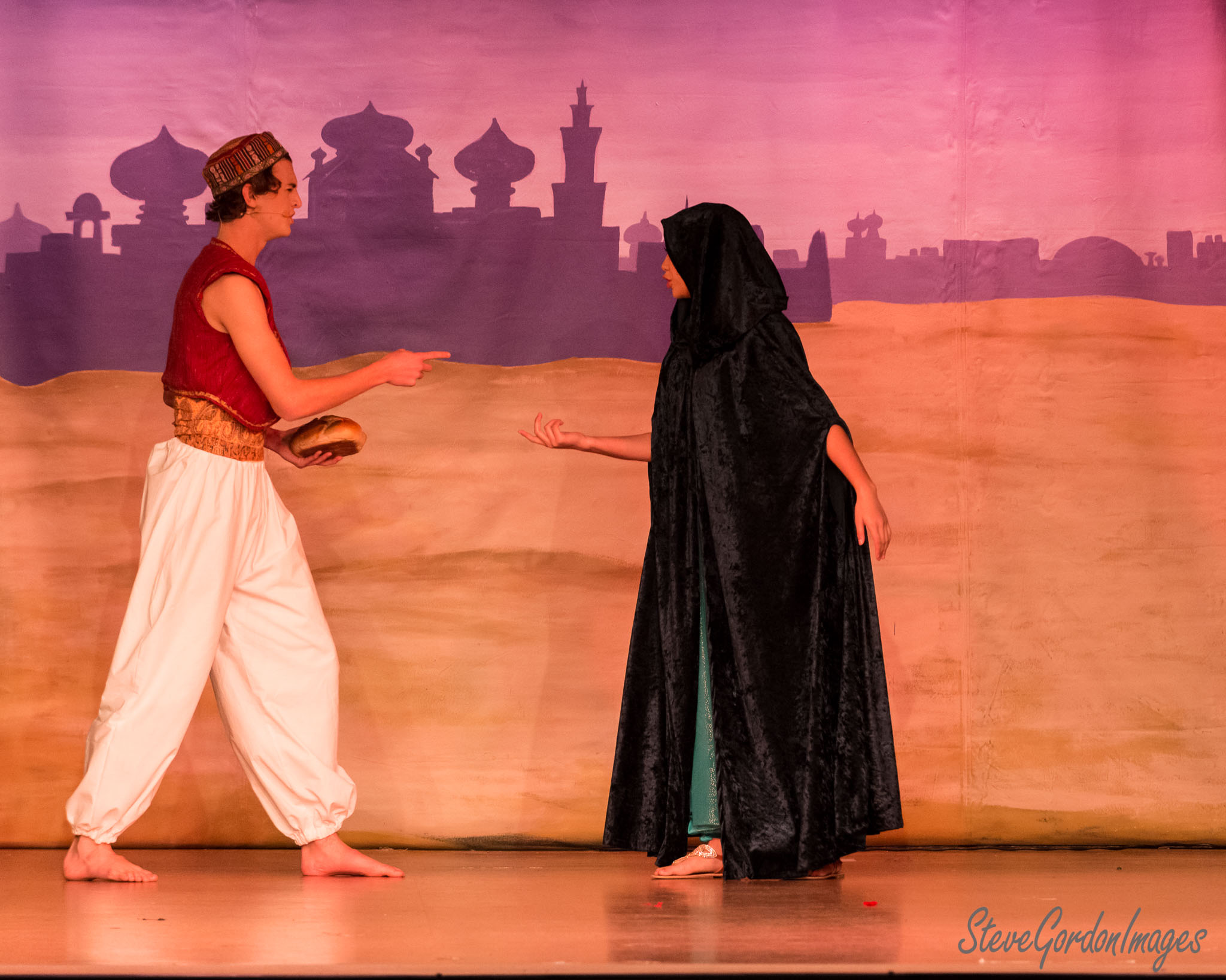 GalleriesArtsTheatre13 AladinPerformancesAladdin And The Mysterious Figure. Aladdin offers bread to the hooded figure, the sorcerer, on a stage with a backdrop. Aladdin And The Mysterious Figure.