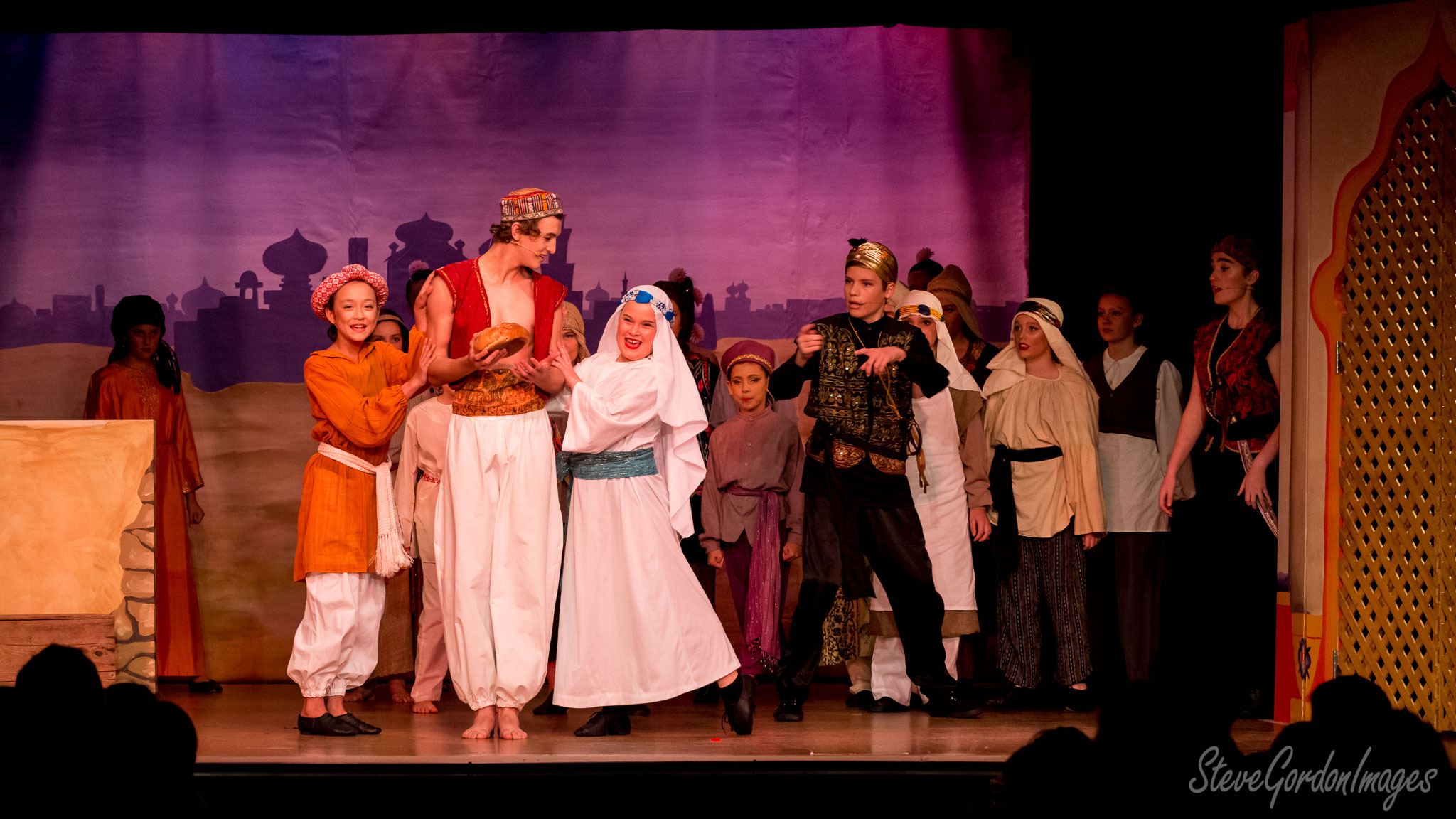 GalleriesArtsTheatre13 AladinPerformancesStage Play: Arabian Nights Performance. A stage production of Aladdin. The actors are in costume, performing a scene with bread. The audience watches. Stage Play: Arabian Nights Performance.