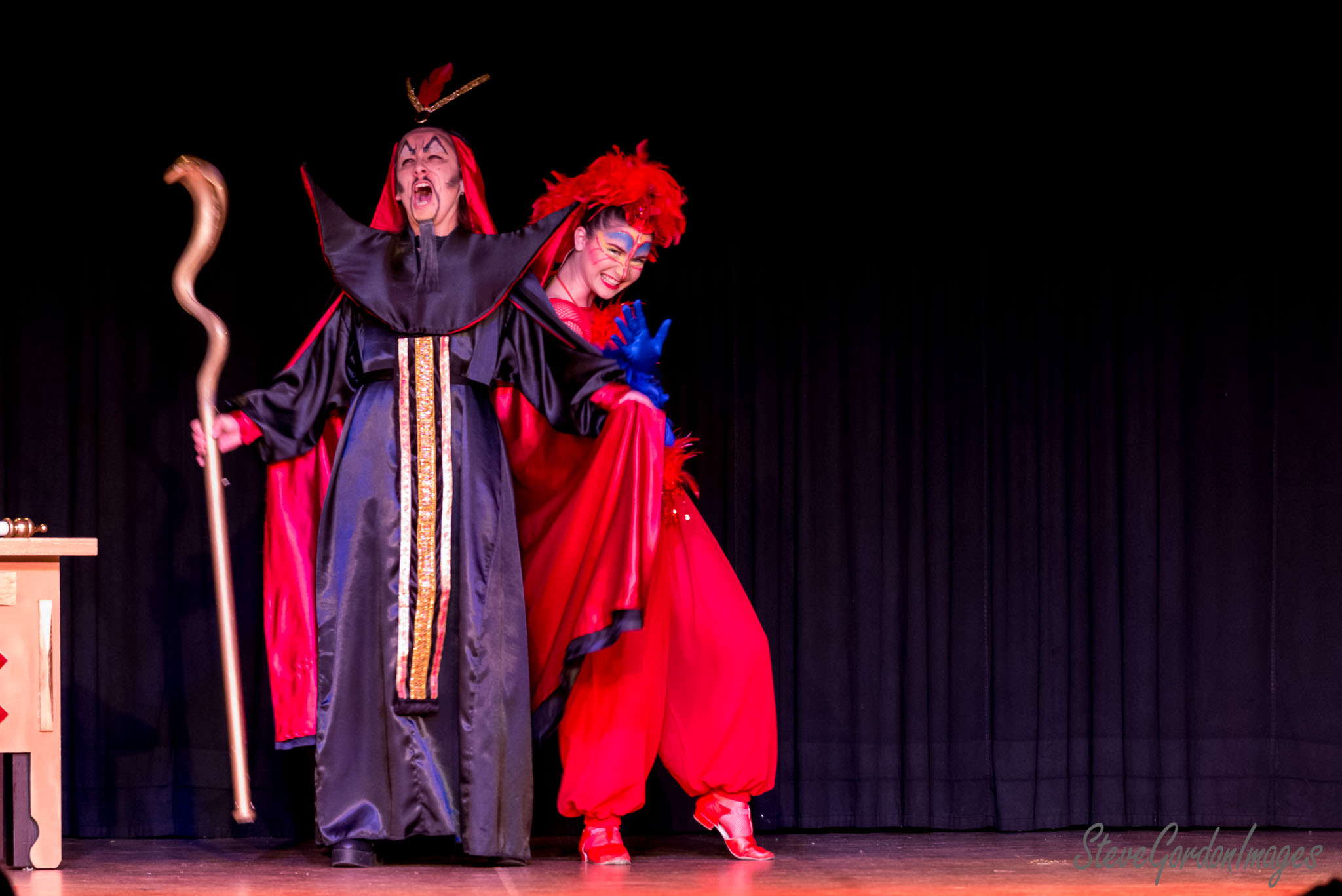 GalleriesArtsTheatre13 AladinPerformancesStage Performance, Costumes, Black Background, Drama. Jafar and Iago perform on stage. Jafar holds a staff, Iago wears red and blue. They act in a play. Stage Performance, Costumes, Black Background, Drama.