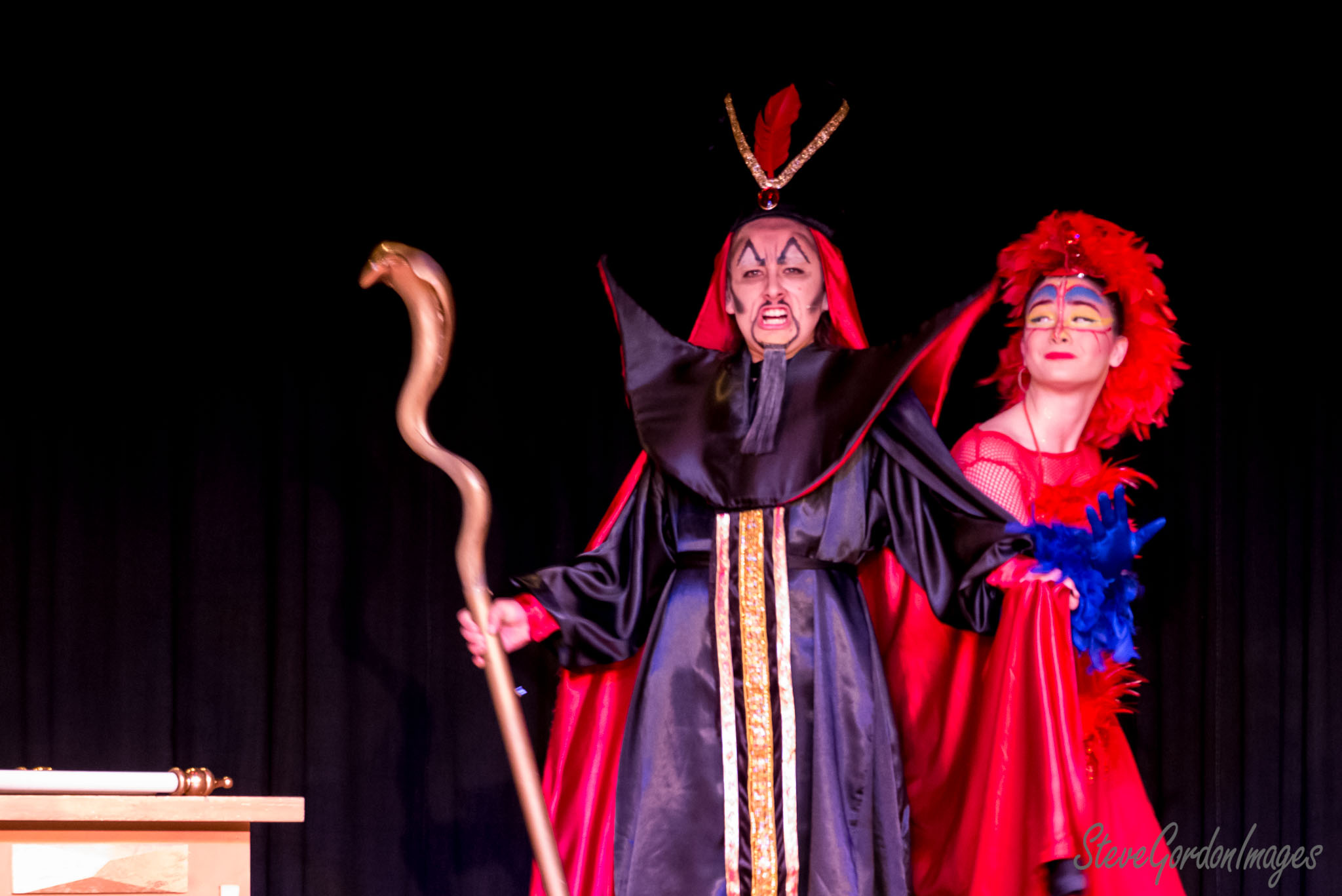 GalleriesArtsTheatre13 AladinPerformancesEvil Stage Play Costume Drama Scene Jafar, with a cobra staff, and Iago, in costume, perform a scene from Aladdin on stage. Evil Stage Play Costume Drama Scene