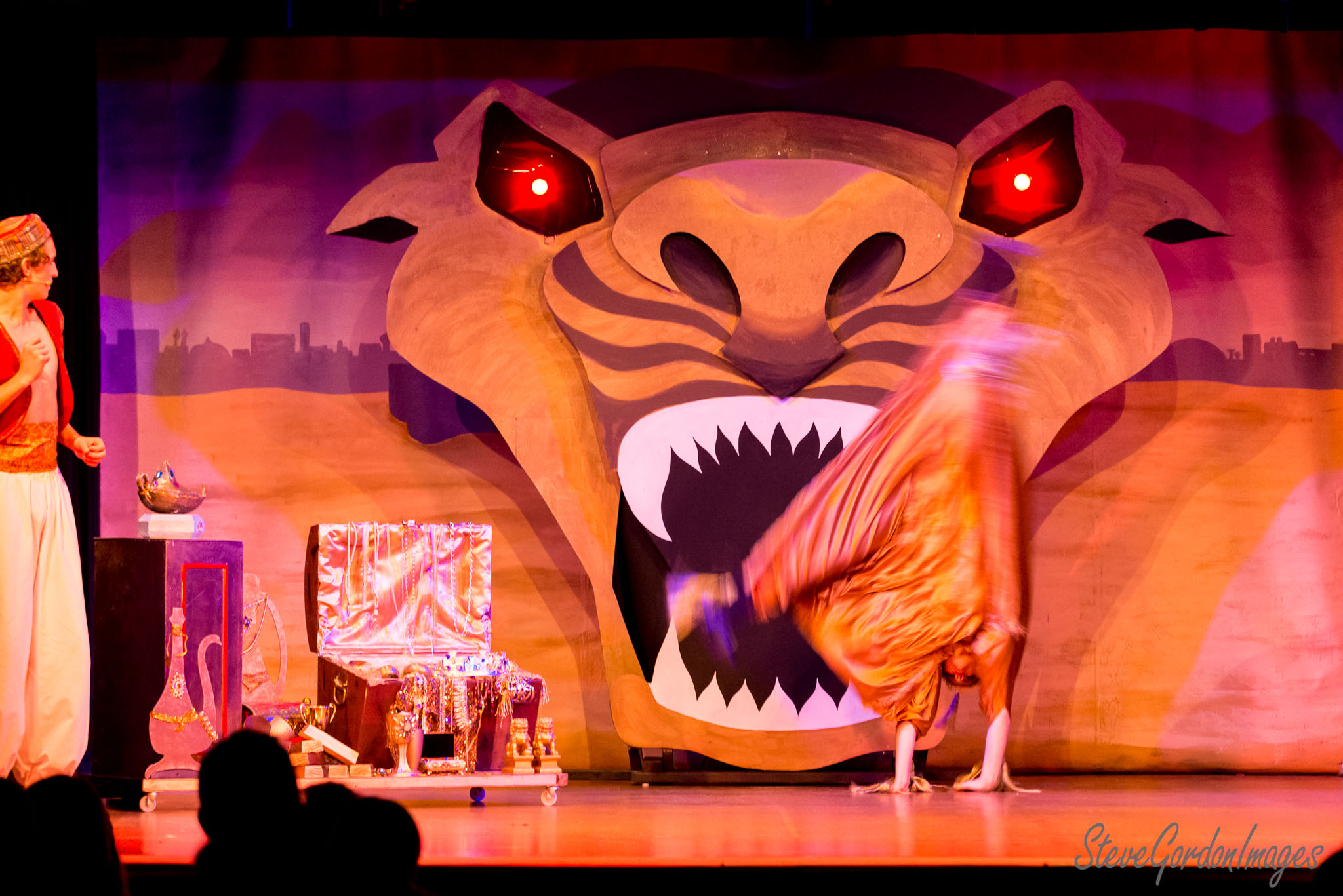 GalleriesArtsTheatre13 AladinPerformancesStage Performance, Tiger, Red Eyes. A performer does a handstand in front of a tiger backdrop during a play. Props are on stage. Stage Performance, Tiger, Red Eyes.