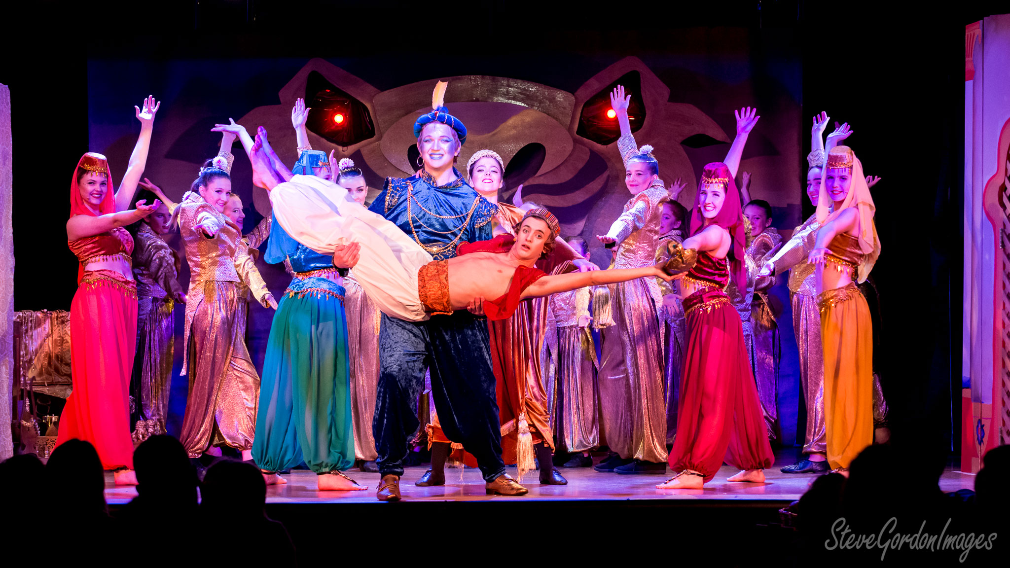 GalleriesArtsTheatre13 AladinPerformancesAladdin's Stage, Colorful, Dramatic, Performance, Dance A stage production of Aladdin. The Genie carries Aladdin as dancers perform on stage. Aladdin's Stage, Colorful, Dramatic, Performance, Dance