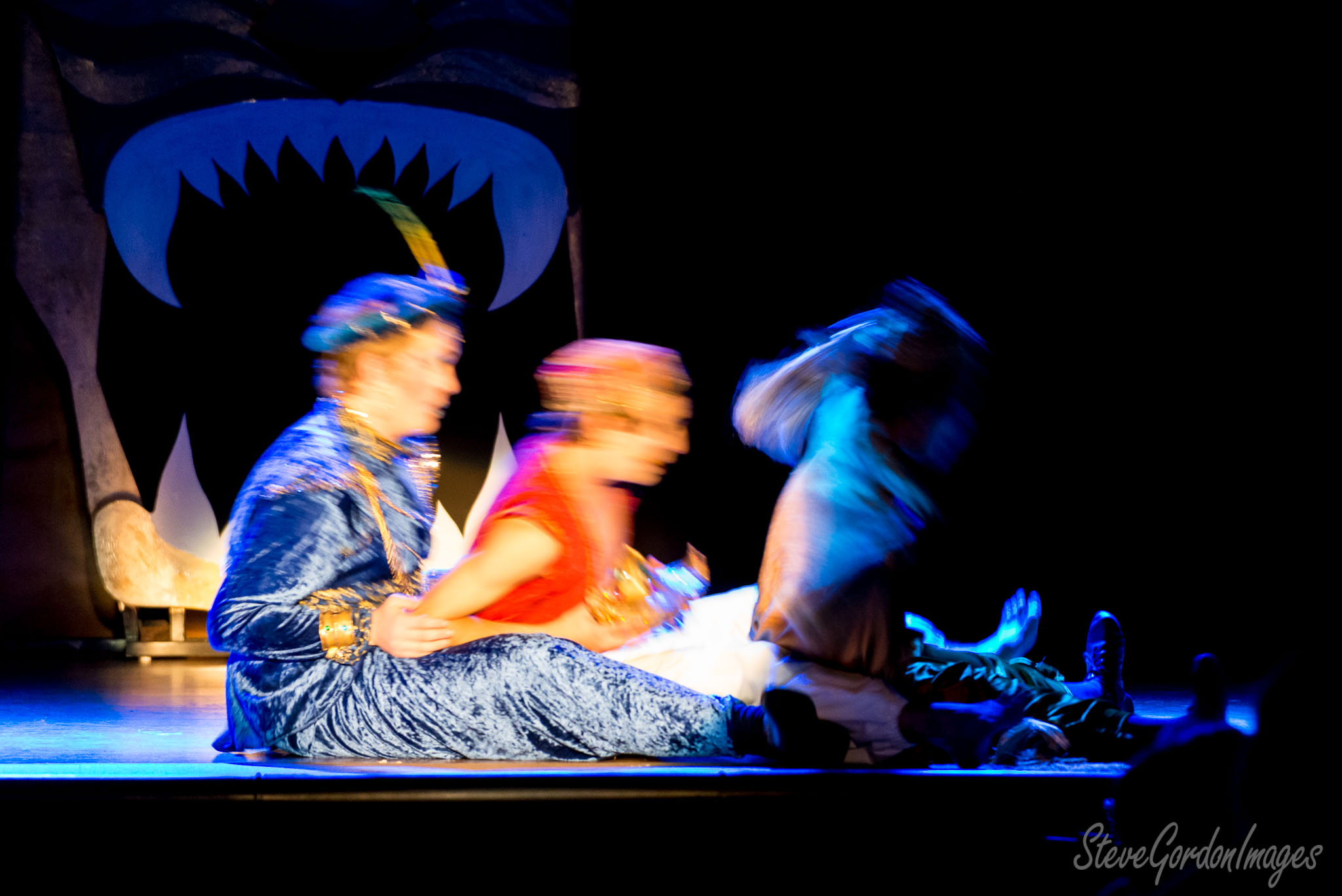 GalleriesArtsTheatre13 AladinPerformancesStage Play, Blurred, Blue, Drama. Actors perform a play. A person in blue costume sits, another in red, and a third lies on stage. Stage Play, Blurred, Blue, Drama.