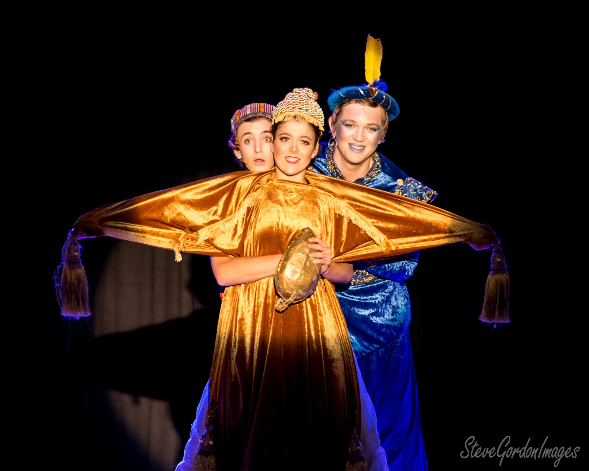 GalleriesArtsTheatre13 AladinPerformancesStage Play, Costumes, Gold, Blue. Three actors in costume perform a play. The center actor holds a golden lamp. The blue actor smiles. Stage Play, Costumes, Gold, Blue.