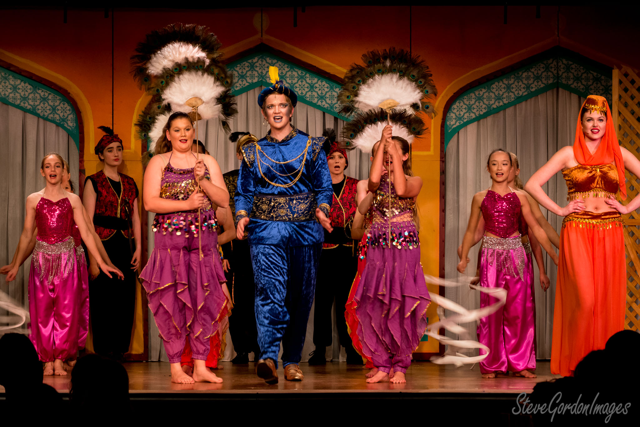 GalleriesArtsTheatre13 AladinPerformancesAladdin Stage Show, Colorful Costumes. A stage production of Aladdin. The Genie, dancers, and other characters perform for an audience. Aladdin Stage Show, Colorful Costumes.