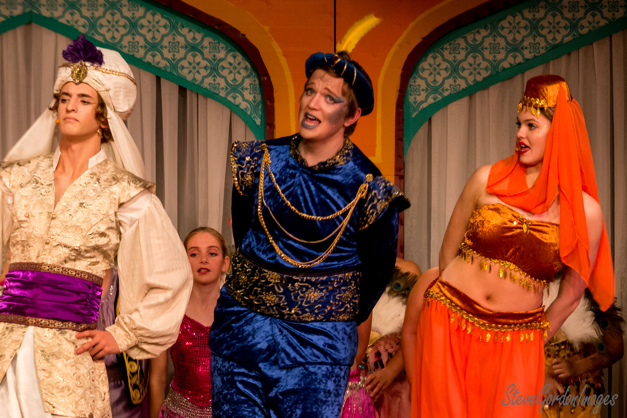 GalleriesArtsTheatre13 AladinPerformancesArabian Nights Stage Play Ensemble. Actors perform a scene from a play. The man in blue sings, others watch, and the woman in orange looks on. Arabian Nights Stage Play Ensemble.