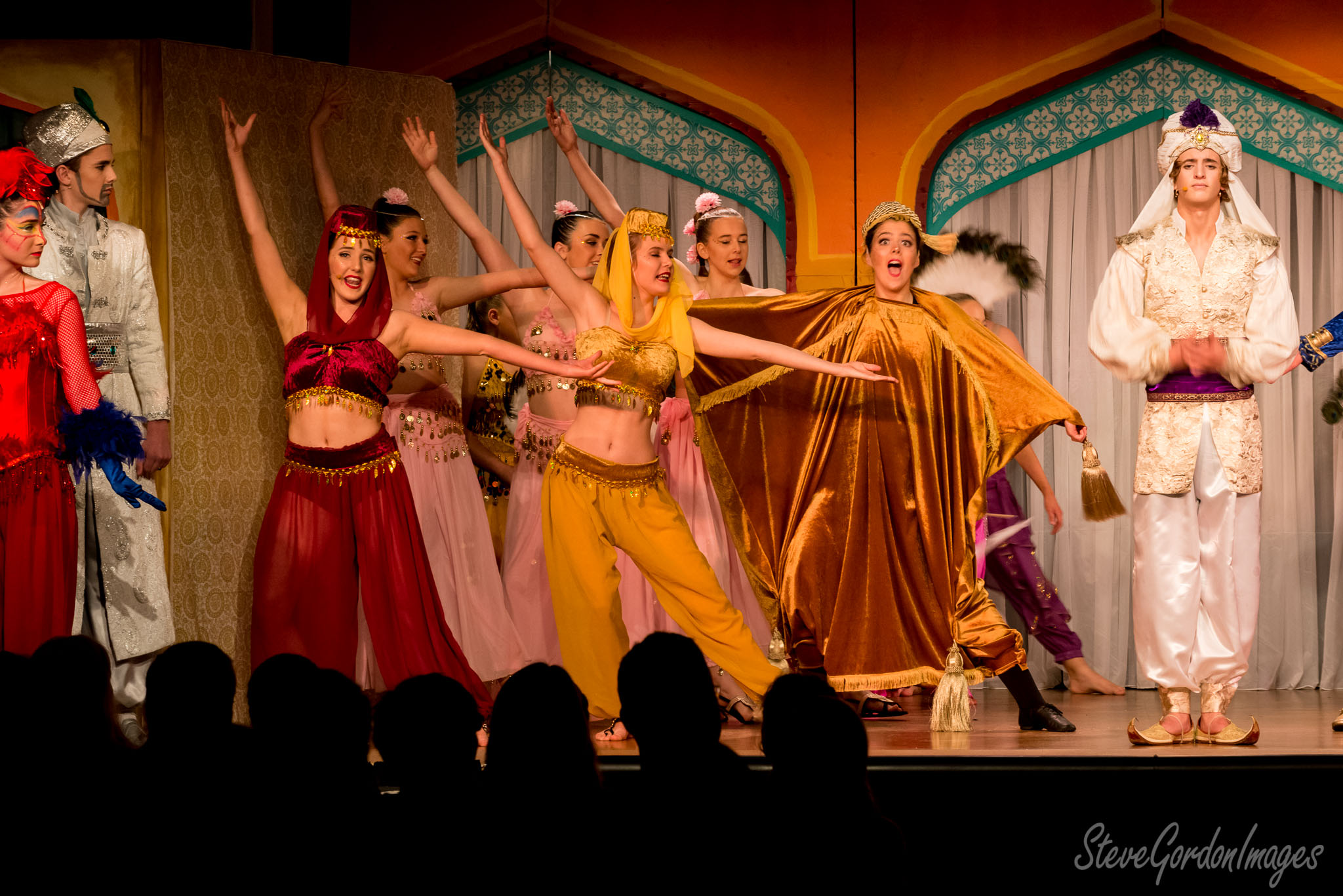 GalleriesArtsTheatre13 AladinPerformancesArabian Nights Stage Performance, Audience View. A stage production of Aladdin. Dancers, Genie, and Sultan perform for an audience. Costumes include gold and red. Arabian Nights Stage Performance, Audience View.
