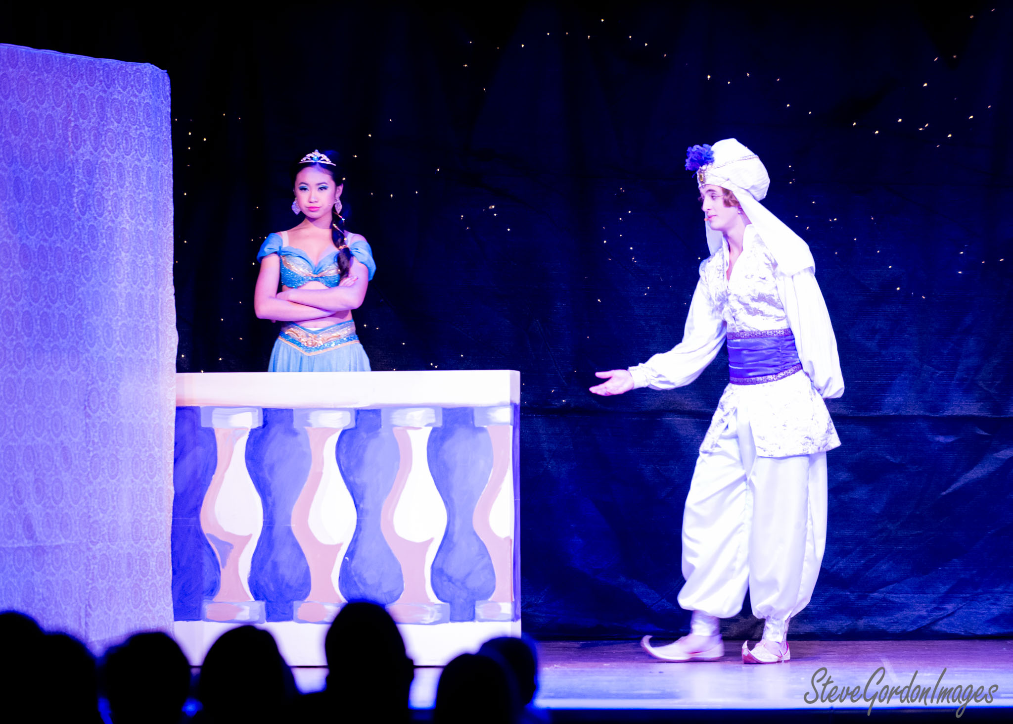 GalleriesArtsTheatre13 AladinPerformancesAladdin And Jasmine Stage Performance. Jasmine, in blue, watches as Aladdin, in white, gestures during a performance of Aladdin. Aladdin And Jasmine Stage Performance.