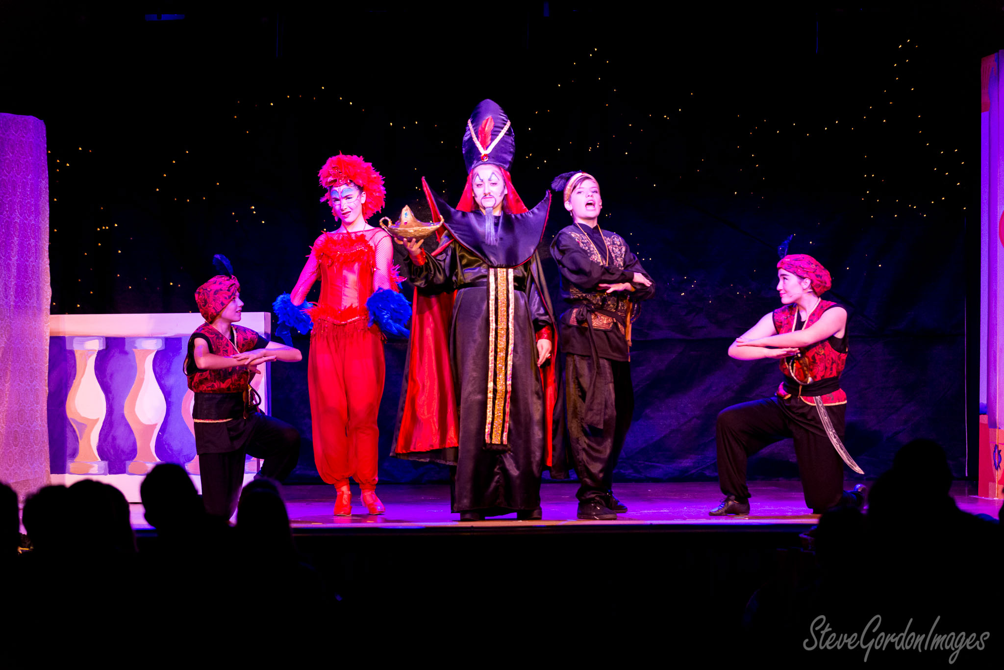 GalleriesArtsTheatre13 AladinPerformancesAladdin Stage Production, Costumes, Performance. Jafar, holding a lamp, stands with his crew during an Aladdin stage performance. The audience watches. Aladdin Stage Production, Costumes, Performance.