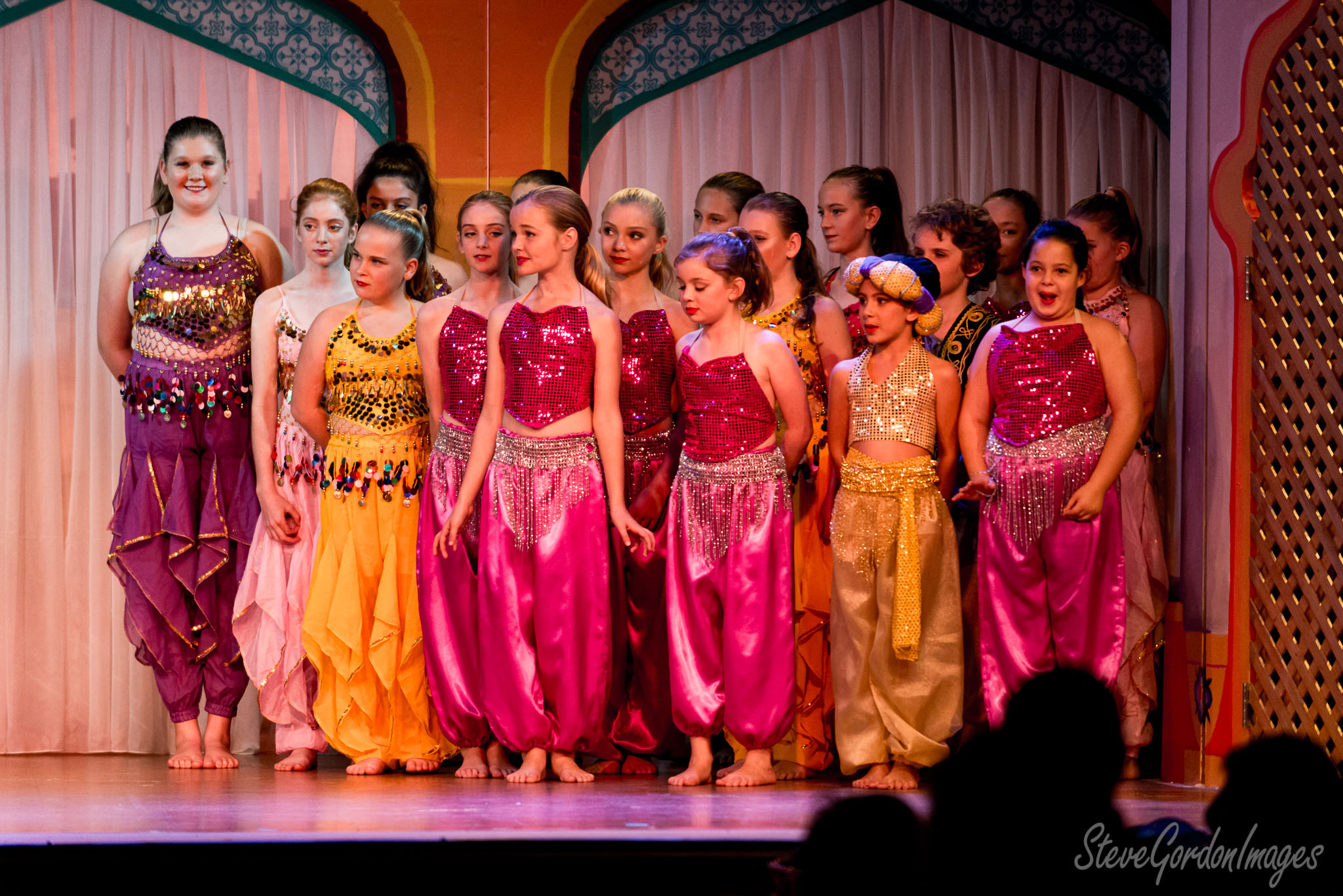 GalleriesArtsTheatre13 AladinPerformancesGirls In Arabian Costumes. A group of young girls in colorful costumes stand on stage, performing a dance. The audience watches. Girls In Arabian Costumes.