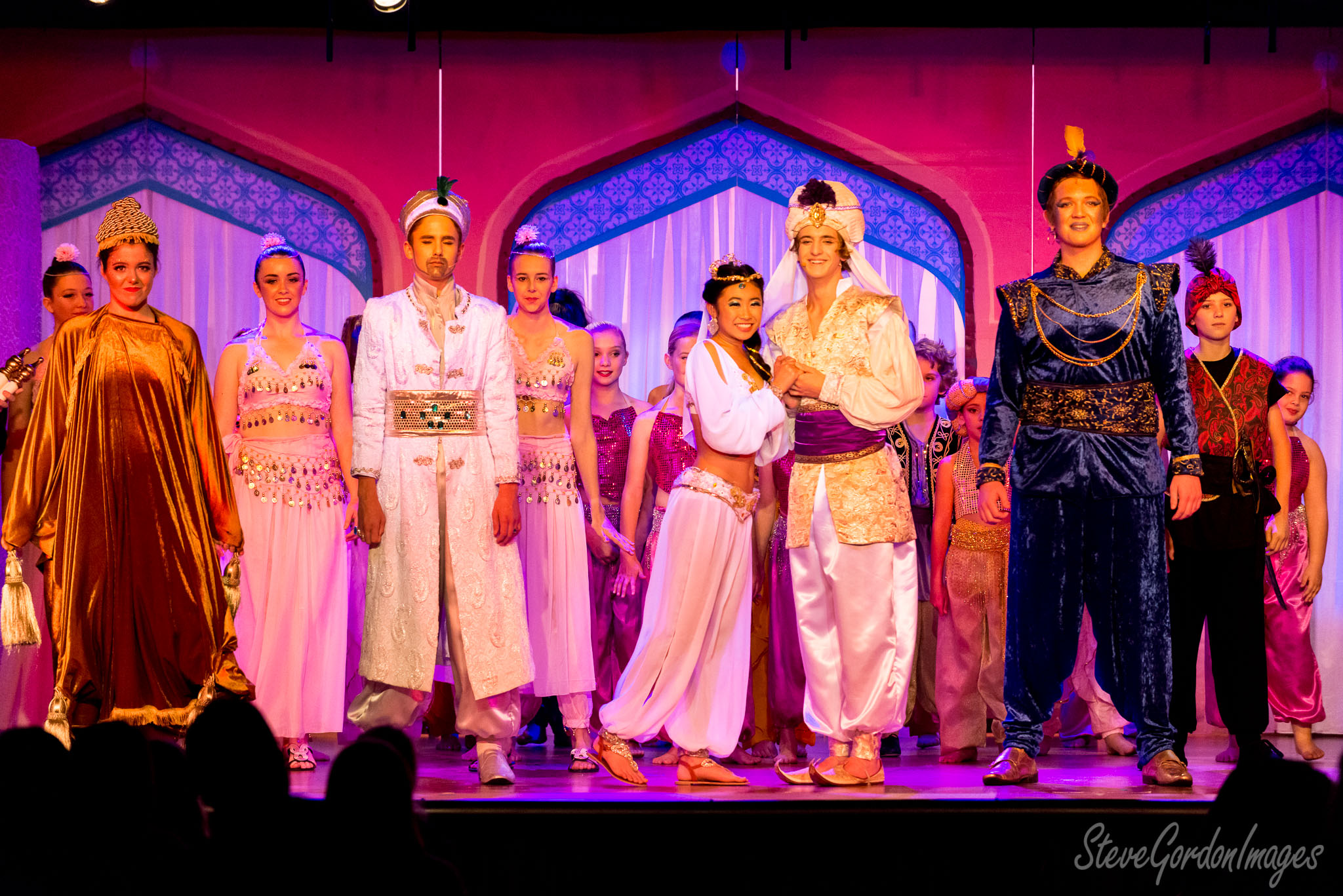 GalleriesArtsTheatre13 AladinPerformancesAladdin Stage Show Cast Ensemble. A stage production of Aladdin. The cast, in costume, stand on stage. The audience watches the performance. Aladdin Stage Show Cast Ensemble.
