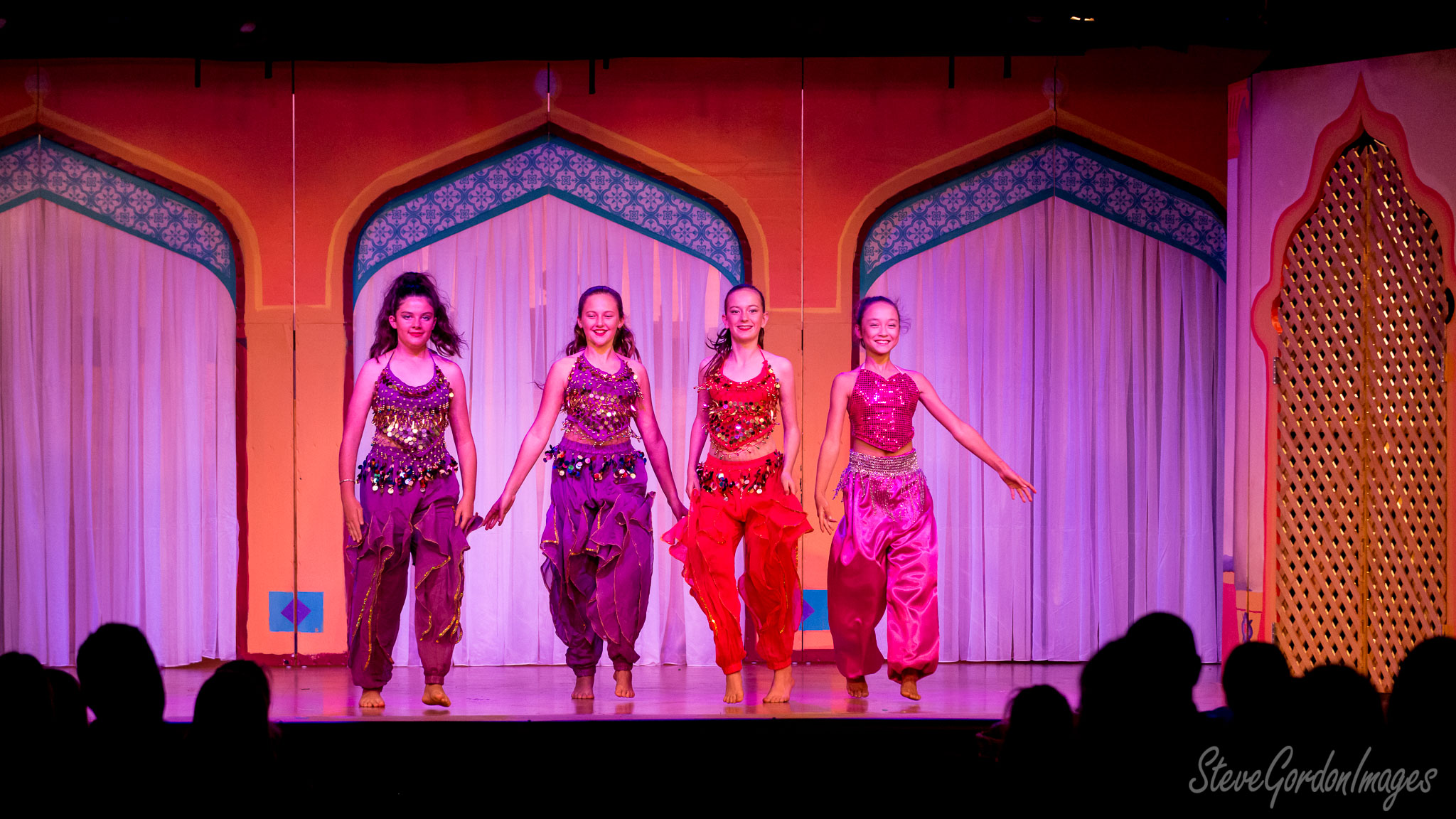 GalleriesArtsTheatre13 AladinPerformancesGirls Dance In Stage Costumes. Four young dancers, in colorful costumes, perform on stage before an audience. They are barefoot. Girls Dance In Stage Costumes.