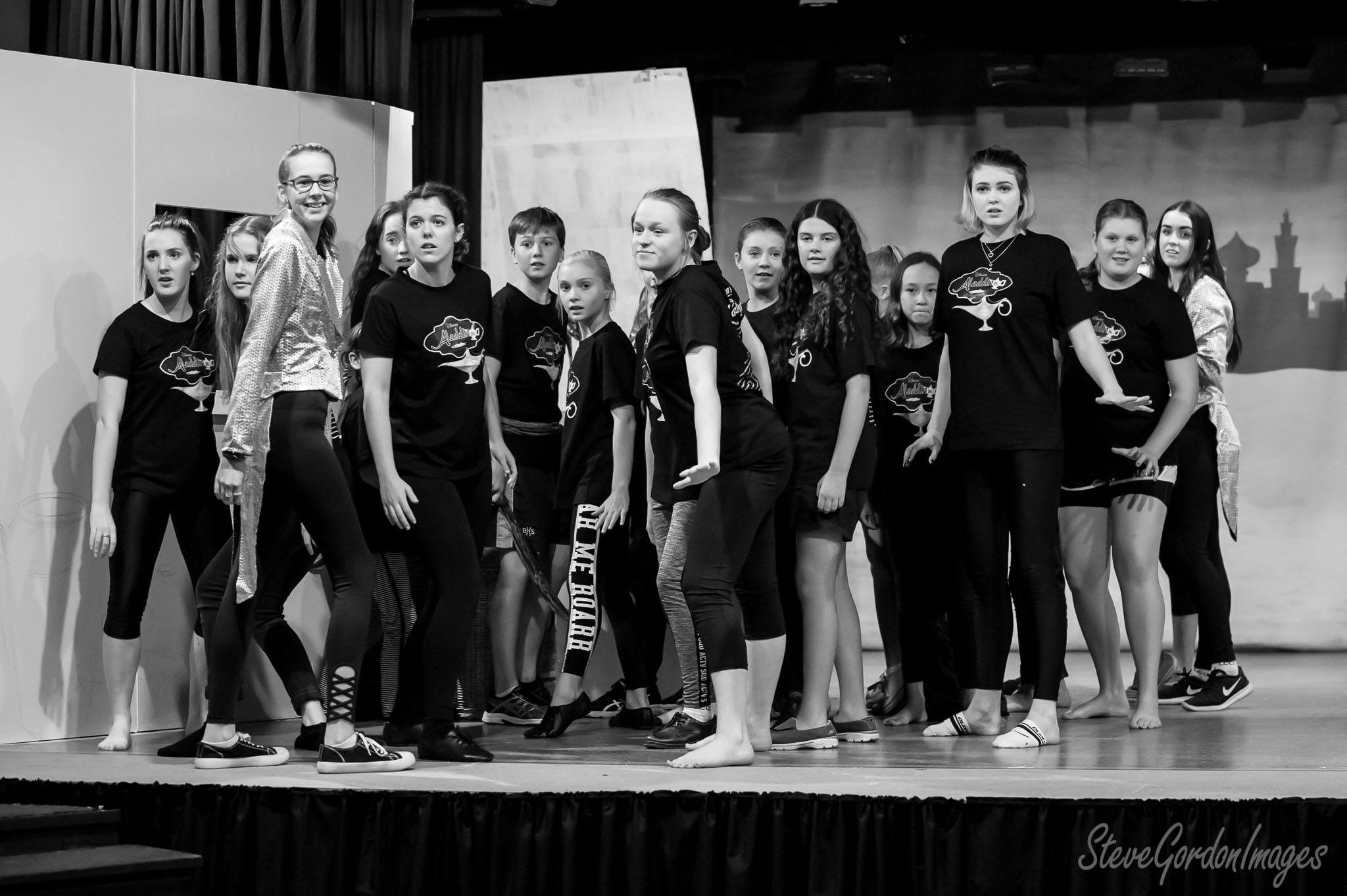 GalleriesArtsTheatre13 AladinRehearsalsStage Performance, Black And White. A cast of "Aladdin" performs on stage. The group wears black shirts and leggings. The show is on. Stage Performance, Black And White.