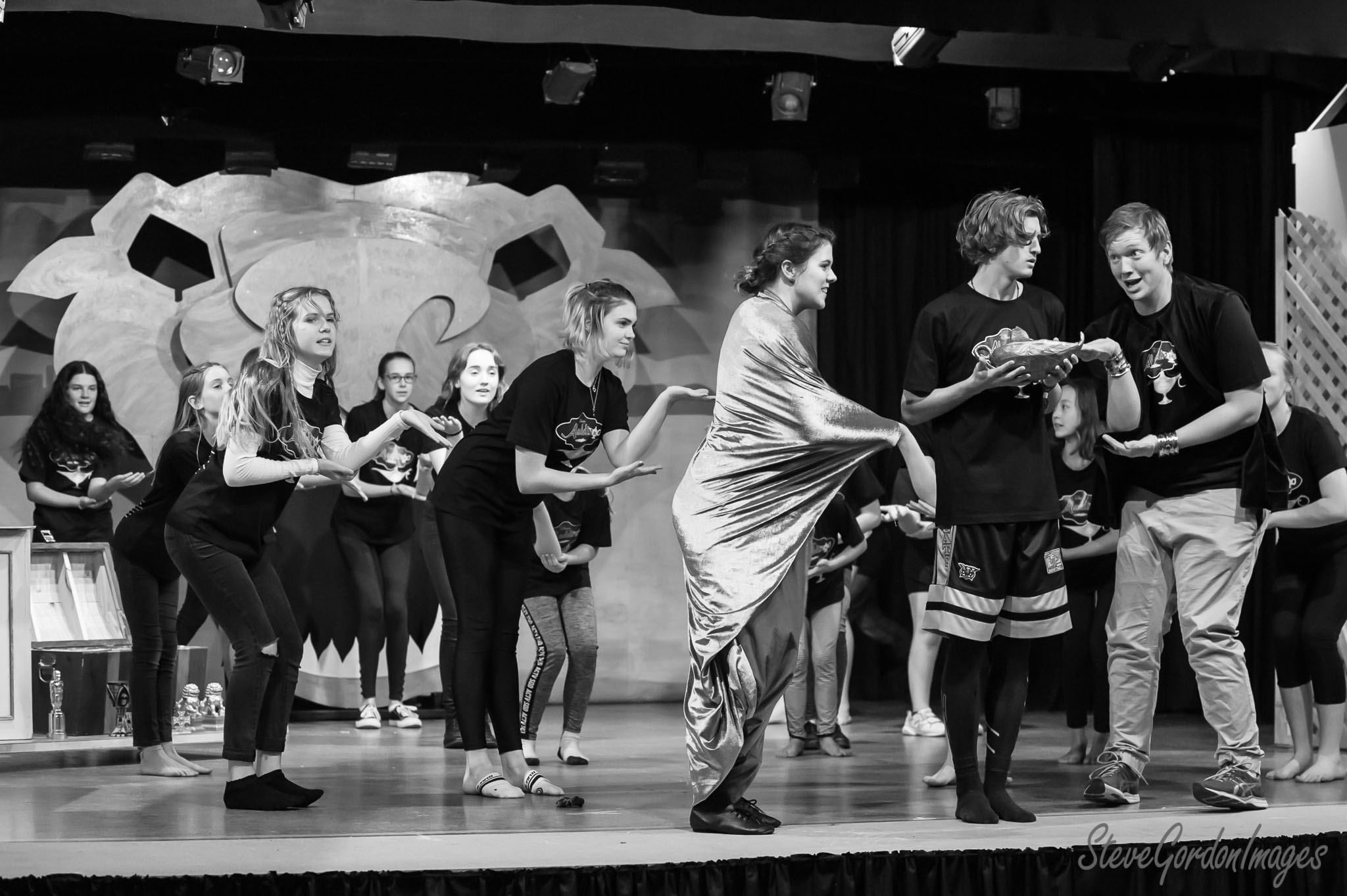 GalleriesArtsTheatre13 AladinRehearsalsStage Play, Black And White. A stage production of Aladdin. Actors perform, holding a prop, while others gesture. The backdrop has a large design. Stage Play, Black And White.
