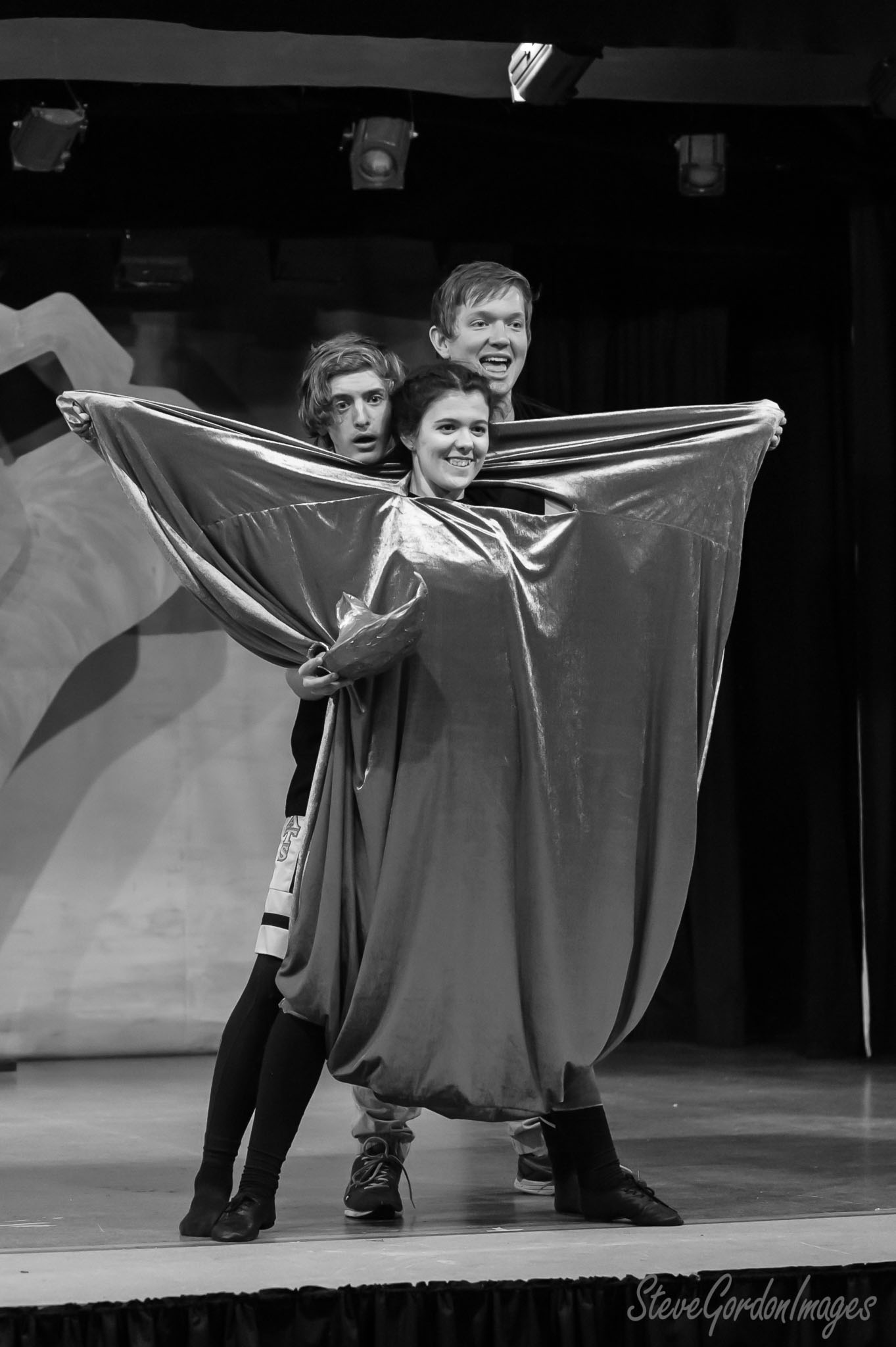 GalleriesArtsTheatre13 AladinRehearsalsTheater Group, Red Fabric, BlackAndWhite. Three actors on stage, holding a red cloth. One wears "ATS" on their leg. They perform. Theater Group, Red Fabric, BlackAndWhite.