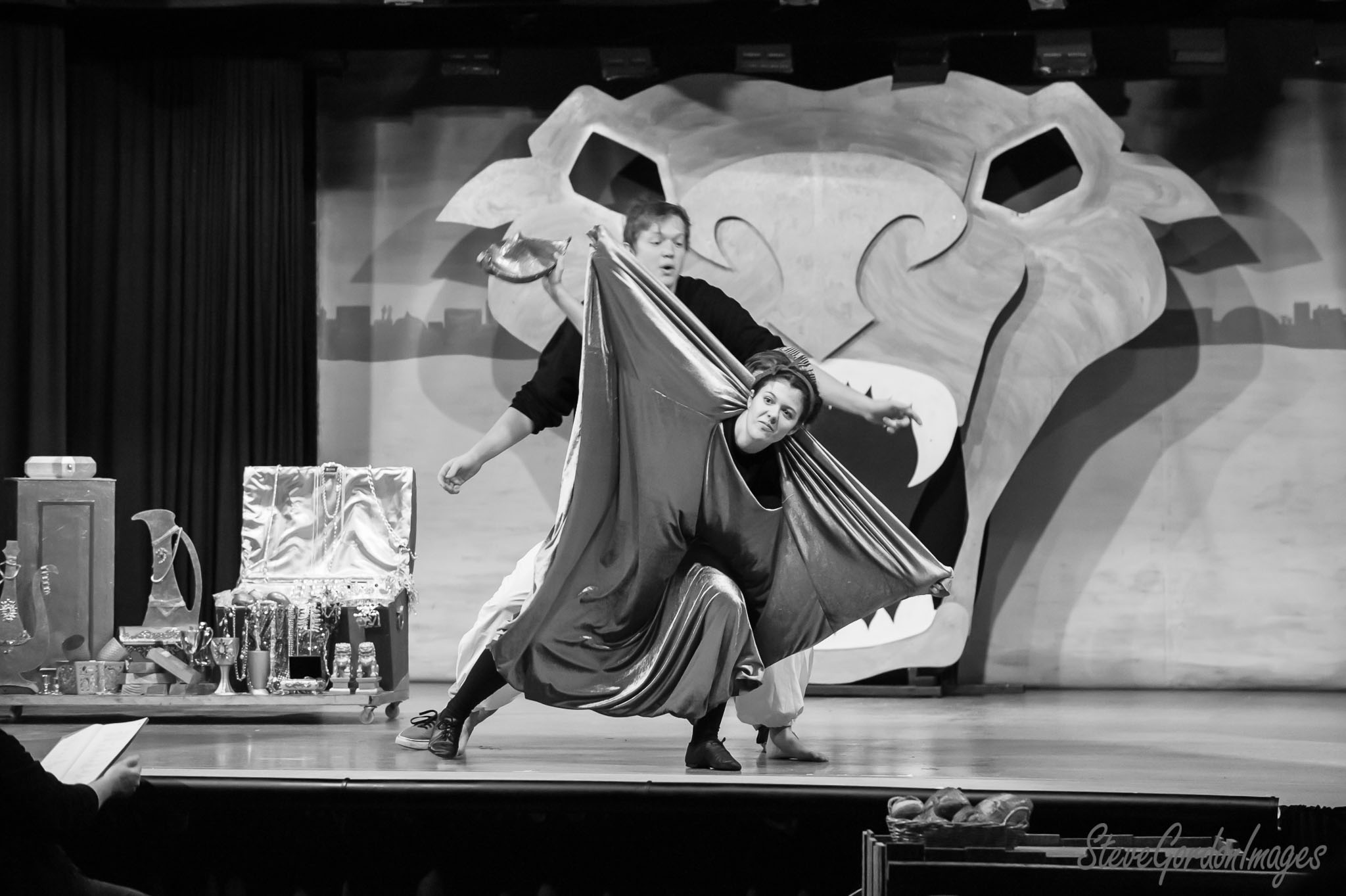 GalleriesArtsTheatre13 AladinRehearsalsStage Play, Costume, Lion Backdrop. Two actors perform on stage, one holds a cloth, the other holds a cymbal, in front of a lion backdrop. Stage Play, Costume, Lion Backdrop.