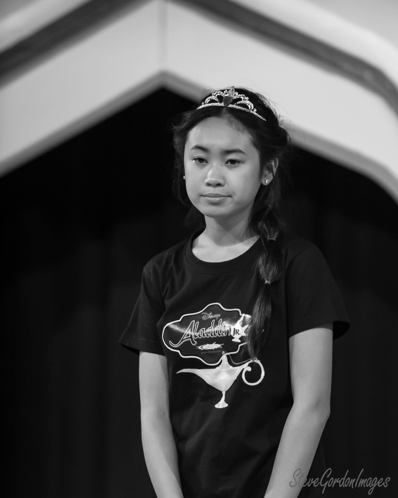 GalleriesArtsTheatre13 AladinRehearsalsAladdin Jr. Stage Princess Portrait. A young woman, wearing a tiara and Aladdin JR. shirt, stands on stage. She is performing. Aladdin Jr. Stage Princess Portrait.