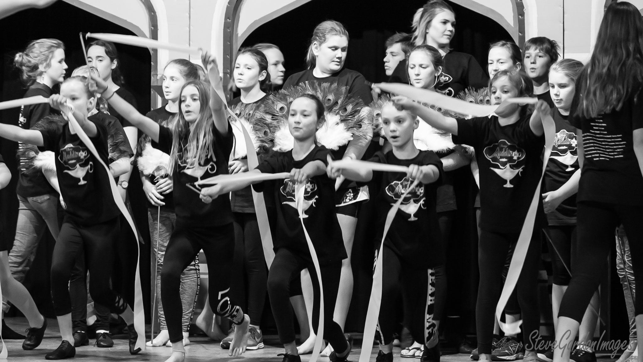 GalleriesArtsTheatre13 AladinRehearsalsRibbon Dance, Aladdin, Black And White Young performers in "Aladdin" production, wearing black shirts, holding ribbons, and dancing on stage. Ribbon Dance, Aladdin, Black And White