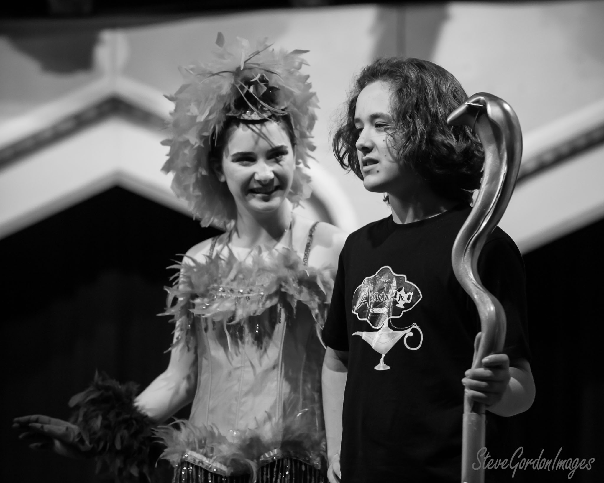 GalleriesArtsTheatre13 AladinRehearsalsAladdin Play, Black And White. Two actors perform in a Disney Aladdin Jr. play. One holds a staff, the other wears a feathered headdress. Aladdin Play, Black And White.
